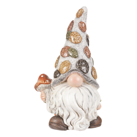 Tato dekorační figurka představuje roztomilého skřítka vyrobeného z magneziové keramiky. Jeho bílé vousy a špičatá šedá čepice imitující kámen s ozdobnými barevnými oblázky dodávají postavičce jedinečný a hravý vzhled. V ruce drží mochomůrku, jako by se zrovna chtěl pochlubit svým úlovkem. Jediným viditelným prvkem z obličeje je jeho nos, což dodává této figurce humorný a tajemný výraz. Tato postavička skřítka je nádherným doplňkem pro vaši zahradu, terasu nebo interiér a určitě přiláká pozornost všech, kdo ji uvidí. Je to malý kousek magie, který přinese do vašeho prostoru radost a pohádkovou atmosféru.