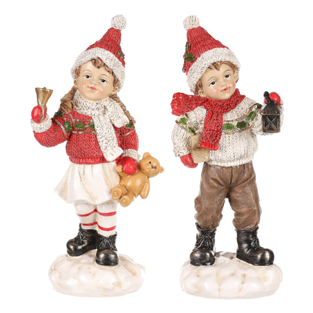 Přidejte do svých vánočních aranží tuto krásnou dekorační figurku, která je k dostání v mixu dvou druhů, a to buď chlapce s dárkem anebo dívky s medvídkem. Oba jsou zimně oblečeni, mají červenou čepičku a jsou z keramiky. Vypadají, jako by se zrovna vrátili ze zimní procházky. S teplým pleteným svetrem, šálou a dalšími ozdobnými doplňky, jsou nejen neodolatelnými vánočními postavičkami, ale také nádhernými ozdobami na stůl, poličku či do vitríny. Figurka dívky či chlapce svým veselým provedením přináší do prostoru hravost a nefalšovanou dětskou radost.