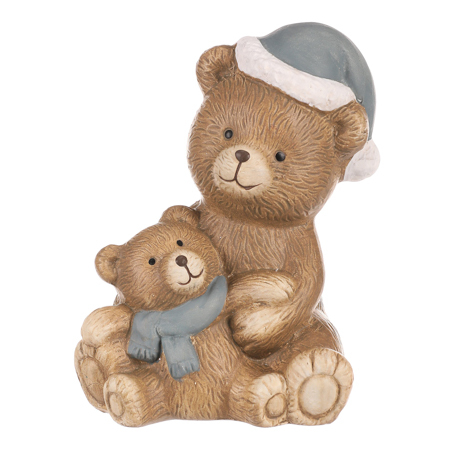 Figurka je umělecky zpracovaná do detailu - medvědice je stylově oblečená ve šedé čepici a její malý potomek si hravě omotal okolo krku šálu stejné barvy, což přidává dekoraci na něžnosti a kouzlu. Tento roztomilý keramický dekor perfektně ladí do vánoční výzdoby, ale zároveň krásně oživí jakýkoli interiér po celý rok.