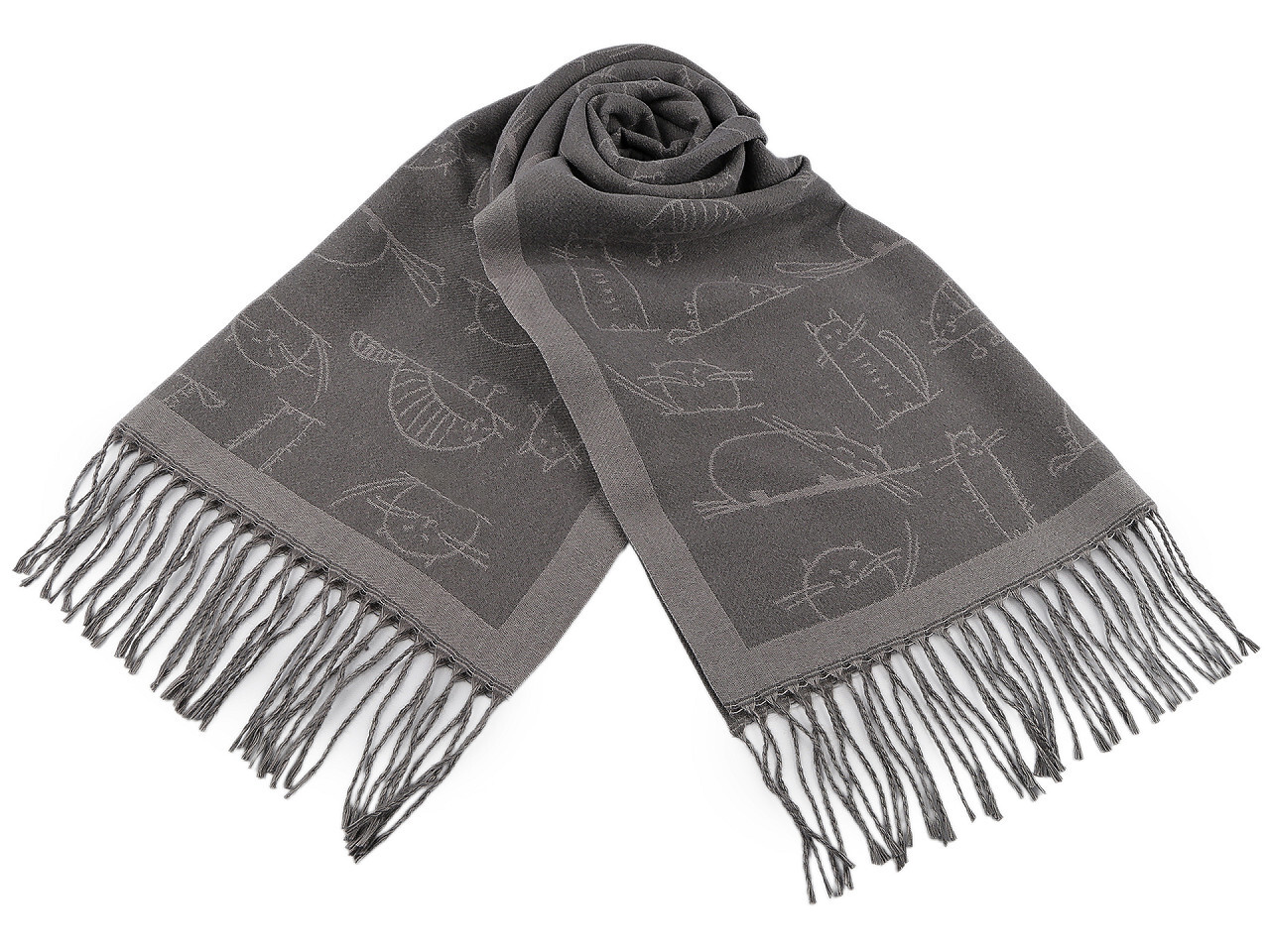 Zimní šála / pléd s třásněmi, kočky 65x180 cm - 1 ks - 16 šedá