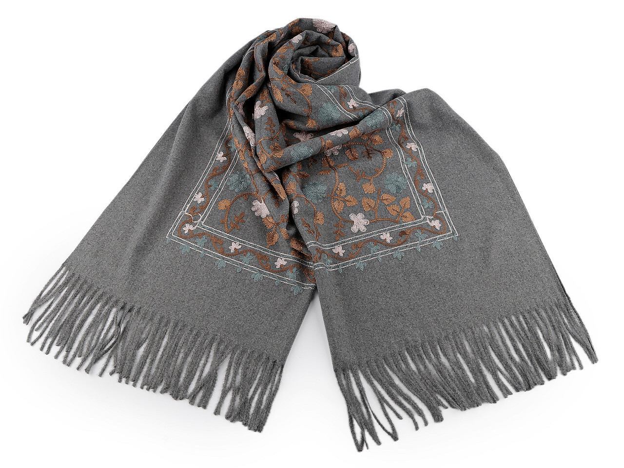 Velký teplý šátek / pléd vyšívaný s třásněmi, typu kašmír 68x165 cm - 1 ks - 7 šedá světlá