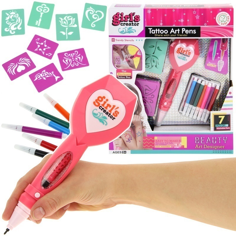 Zestaw z maszynką pozwoli dzieciom stworzyć domowe studio tatuaży. W zestawie znajdują się niezbędne akcesoria, za pomocą których powstaną kolorowe i zmywalne tatuaże.Zestaw do tatuaży zawiera:maszynkę do tatuażu,aerograf,7 kolorowych tuszy w formie pisaka,8 szablonów z wzorami tatuaży,instrukcję.Cechy:zabawka wymaga użycia baterii: 2x1,5V AAA(brak w zestawie),tatuaże są łatwo zmywalne pod wodą,wysokość maszynki: 20cm,wymiary pojedynczego szablonu: 5,5x7,5cm,wymiary opakowania: 26,2x6,2x31,5cm,wiek: 5+.