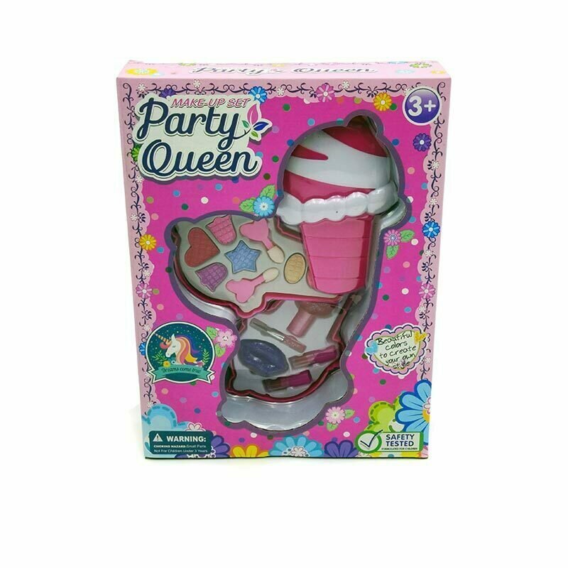 Zestaw piękności do makijażu z paletką cieni w kształcie różowo-białego loda rożka. Paletka otwiera się i zamyka. Kosmetyki są przyjazne oraz nietoksyczne dla skóry i można je łatwo zmyć. Idealny zestaw do makijażu dla każdej dziewczynki.Zawartość:- 6 cieni do oczu,- 2 aplikatory,- 2 pomadki- błyszczyk,- pędzelek do ust,- lakier do paznokci. Wymiary opakowania: 21x28x5,5cmWiek: 3+