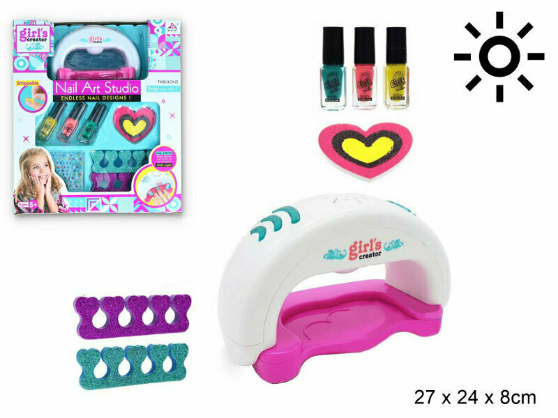 Zestaw do zdobienia paznokci. Pomalowane na wybrany kolor paznokcie można ozdobić kolorowymi naklejkami.Zestaw zasilany bateriami: 2x1,5V AAA (brak w zestawie).Zestaw zawiera: -suszarkę do paznokci,-3 lakiery do paznokci w modnych kolorach,-2 separatory,-małe naklejki na paznokcie,-pilniczek w...