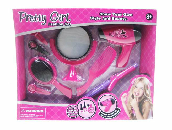 Zestaw piękności idealny dla każdej dziewczynki. W skład zestawu wchodzą: trzy spinki, szczotka, lusterko, grzebień, lokówka, suszarka. Głównie wykonany w kolorze różu. Pokaż swój własny styl i piękno. Wymiary opakowania: 34x27x6 cmWiek: 3+