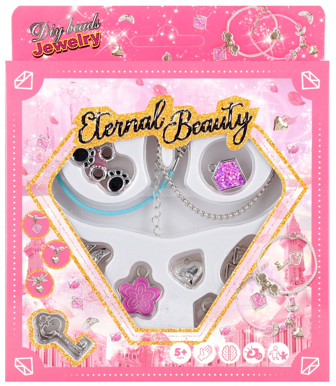 Zalety produktu: rozwija kreatywność dziecka, dziecko może poczuć się jak mała Księżniczka. Zestaw Piękności to podstawowa pozycja w kolekcji zabawek każdej dziewczynki, wchodzącej coraz większymi krokami w życie. Akcesoria MEGA CREATIVE wydobędą z niej prawdziwą młodą damę Zawartość zestawu: 2x bransoletki, różnego rodzaju i różnych wielkości zawieszki w kształcie kwiatów i nie tylko. Wykonane z plastiku, metalu sznurka Wymiary/waga/baterie: wymiar opakowania dł. x wys. x gł. cm : 15x18x4, Waga produktu bez opakowania kg. 0,04 kg. waga produktu w opakowaniu kg : 0,08 kg, Nie wymaga zasilania bateriami. Zestaw przeznaczony dla dzieci w wieku: 5 . Pakowany w kartonik z okienkiem. Pakowanie w kartonie zbiorczym po 144/288 szt.