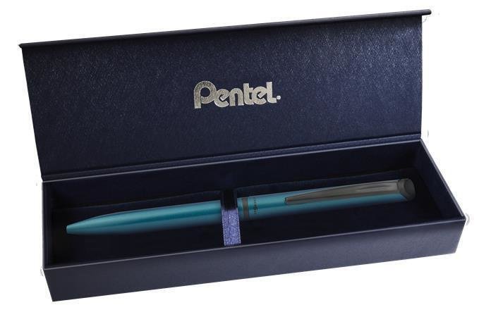 Kuličkové pero prémiové kvality s tenkým kovovým tělem a otočným mechanismem. V elegantní matné barvě. Inkoust EnerGel zasychá prakticky okamžitě, při používání se netvoří šmouhy ani fleky. Vhodné i pro leváky Gravírovatelné Šířka stopy: 0,35 mm Barva pera: tyrkysová Barva náplně: modrá Náhradní náplň: PENLR7K Dárkové balení