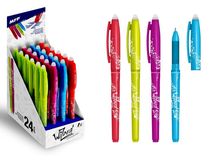 Magické, kuličkové pero Wizard obsahuje speciální inkoust tzv. vymaž a přepiš, nebo vymaž a nech znovu objevit. Pokud uděláte chybu, stačí jen otočit pero a plastovou špičkou text vymažete. Špička zahřeje inkoust, ten zmizí a lze je znovu přepsat. Můžete si psát i tajné vzkazy, po vygumování stačí jen papír ochladit pod bod mrazu a text se znovu objeví.