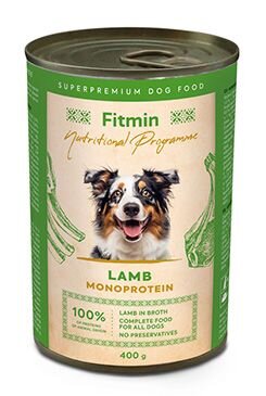 Kompletní mokré krmivo pro dospělé psy všech plemen z řady Fitmin Výživový program je vyrobeno z čerstvého masa. Krmivo je vhodné i pro štěňata a mladé psy. Lahodné krmivo je vhodné na ochucení granulí nebo za odměnu do misky. Monoproteinová konzerva s jehněčím masem je vhodná pro malé i velké mlsné psy. Mokré krmivo Fitmin Výživový program je bez obilovin, bez GMO a neobsahují žádná barviva, umělé konzervační látky a dochucovadla.