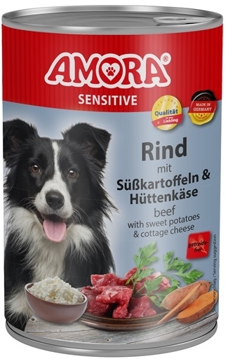 AMORA Sensitive je obzvláště vyvážené kompletní krmivo pro dospělé psy vyrobené výhradně z kusů hovězího masa a drobů v kombinaci s batáty. Přednosti krmiva AMORA Sensitive: Obzvláště vyvážené kompletní krmivo Německá výroba Bez vepřového masa Bez umělých dochucovadel, barviv nebo konzervantů Bez cukru Výhradně z kusů kvalitního masa a drobů Dobře snášenlivé a vysoce stravitelné krmivo Monoproteinové složení Bez lepku a obilovin Vhodné pro potravinové alergie u psů Pouze 74-75% obsah vlhkosti Díky prvotřídním surovinám je AMORA Sensitive velmi dobře snášena a vysoce stravitelná, proto je vhodná i pro psy s citlivým zažíváním. Vyrobeno v Německu. Složení: 62% tvoří hovězí srdce, hovězí játra, hovězí plíce, hovězí dršťky, hovězí maso, 28,8% vývar, 4% sladké brambory, 4% tvaroh, 1% minerály, 0,2% slunečnicový olej. Doplňkové látky: výživové přísady / kg Vitamin D3 200 IU, zinek jako síran zinečnatý (monohydrát) 15 mg, mangan jako síran manganatý II (monohydrát) 3 mg, jód jako bezvodý jodičnan vápenatý 0,75 mg. Analytické složky: Hrubá bílkovina: 10,8 %,Hrubý tuk: 6,5 %,Hrubý popel: 2,1 %, Hrubá vláknina: 0,5 %, Vlhkost: 75,0 % Doporučené denní dávkování: Přibližně 400 g krmiva denně na každých 10 kg tělesné hmotnosti dospělého psa. Množství uvedená je třeba považovat za orientační. Doporučuje se upravit denní dávku podle skutečných potřeb zvířete. Minimální trvanlivost a identifikační číslo šarže: viz štítek na dně nebo víku konzervy.