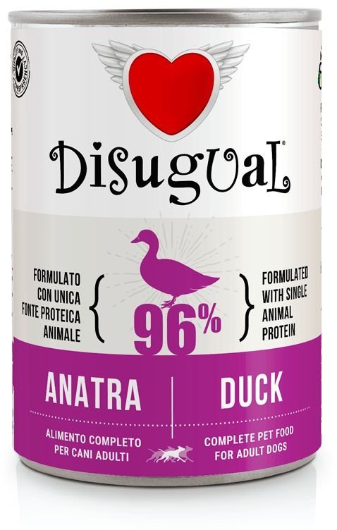 Perfektní krmivo Monoprotein Disugual je skvělou volbou pro všechny psy, kteří mají alergie na určité přísady nebo mají citlivé trávení. Krmivo obsahuje pouze kachní maso. Kvalitní masové konzervy se získávají z nepoužitých částí při výrobě lidské potravy, čímž se snižuje počet zvířat poražených pro potravinářské účely. Je vyrobeno z kvalitního masa, které je určeno k lidské spotřebě, čímž se snižuje negativní dopad na životní prostředí. Výhody konzerv Disugual: vhodné pro všechny psy bez ohledu na věk a plemeno pouze jeden druh masa bez konzervačních látek a barviv vhodné pro citlivé psy z masa schváleného k lidské spotřebě SLOŽENÍ: maso a živočišné deriváty (kachna 96%) minerální látky, cukry. DOPLŇKY NA KG: Nutriční: vit A 5000IU, vit D3 335IU, vit E 41mg, uhličitan železitý 3,29mg, pentahydrát síranu měďnatého 2,5mg, oxid manganičitý 10,3mg, oxid zinečnatý 8mg, sodná sůl 0,014 mg. ANALYTICKÉ SLOŽENÍ: Vlhkost 81,8%, sur. bílkoviny 8,1%, sur. oleje a tuky 7,0%, sur. vláknina 0,2%, sur. popel 3,2%. DOPORUČENÉ DENNÍ DÁVKOVÁNÍ: Hmotnost psa (kg) Množství (g) 1-5 120-350 10-15 600-850 20-25 1100-1200 30-35 1400-1600 Množství uvedená v tabulce je třeba považovat za orientační. Doporučuje se upravit denní dávku podle skutečných potřeb zvířete.