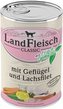 Konzerva Landfleisch s drůbežím masem, filetem z lososa a zeleninou. Kompletní krmivo pro dospělé psy všech plemen. Landfleisch konzervy jsou exkluzivně vyráběny z čerstvého masa a čerstvé zeleniny. Všechny suroviny pocházejí z přírody z německých farem. Obsahuje pouze čerstvé maso z jatečných zvířat kontrolovaných potravinami, které jsou určeny k lidské spotřebě. Bez umělých barviv, umělých dochucovadel a konzervačních látek. Výroba je v Německu a zvláštní důraz je kladen na původ surovin. Benefity konzerz Landfleisch: obsahuje čerstvou zeleninu obsahuje vysoce kvalitní bílkoviny poskytují esenciální aminokyseliny pro svalový metabolismus obsahuje všechny potřebné vitamíny, které zajišťují dobrý zdravotní stav obsahuje Omega 3+6 mastné kyseliny, které zajišťují zdravou pokožku a lesklou srst obsahuje kvalitní tuky, které poskytnou optimální energie obsahuje přírodní vlákninu neobsahuje umělá barviva neobsahuje umělá dochucovadla neobsahuje chemické konzervační látky neobsahuje sójové produkty Složení: 45 % maso a vedlejší produkty živočišného původu (z toho 30 % kachna, 25% kuře), 25 % ryby a vedlejší produkty z ryb (z toho 35 % filet z lososa), 23 % drůbeží masový vývar a rybí vývar, 5 % zelenina (mrkev, hrách), minerální látky, rostlinné oleje (omega-3 + omega-6 mastné kyseliny), inulin Doplňkové látky: Vitamin A: 2 500 IU; Vitamín D3 (E671): 250 IU; vitamín E: 25 mg; biotin 25 µg Analytické složky: Hrubá bílkovina: 8,0 %,Hrubý tuk: 6,0 %,Hrubý popel: 2,6 %, Hrubá vláknina: 0,6 %, Vlhkost: 78,0 % Technologická aditiva: Cassia-gum 2500 mg. Doporučené denní dávkování: Hmotnost psa Množství 5 kg cca. 400g 15 kg cca. 800g 25 kg cca 1200g Množství uvedená v tabulce je třeba považovat za orientační. Doporučuje se upravit denní dávku podle skutečných potřeb zvířete. Minimální trvanlivost a identifikační číslo šarže: viz štítek na dně nebo víku konzervy.