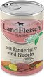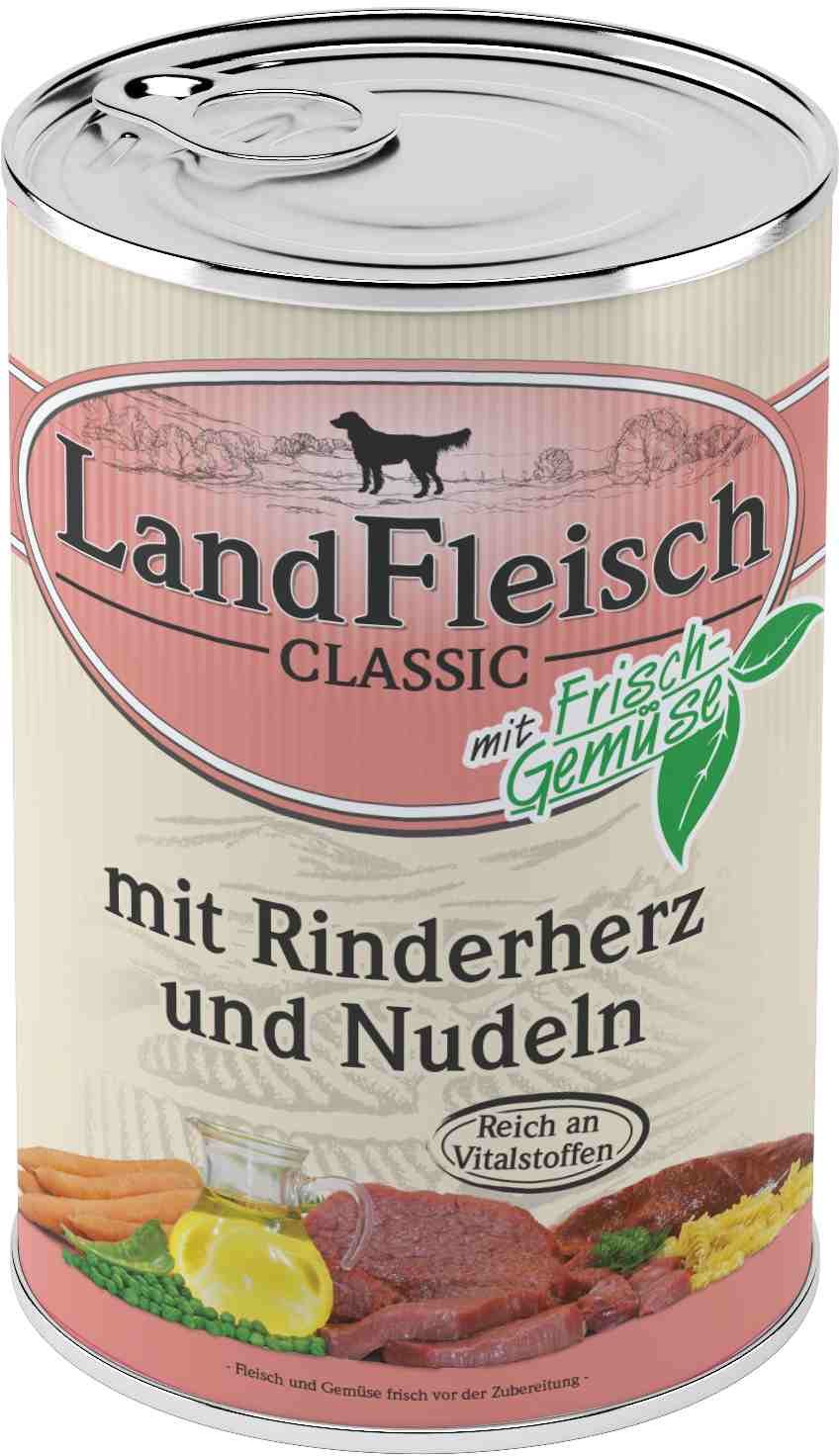 Konzerva Landfleisch hovězí srdce, těstoviny a zelenina. Kompletní krmivo pro dospělé psy všech plemen. Landfleisch konzervy jsou exkluzivně vyráběny z čerstvého masa a čerstvé zeleniny. Všechny suroviny pocházejí z přírody z německých farem. Obsahuje pouze čerstvé maso z jatečných zvířat kontrolovaných potravinami, které jsou určeny k lidské spotřebě. Bez umělých barviv, umělých dochucovadel a konzervačních látek. Výroba je v Německu a zvláštní důraz je kladen na původ surovin. Benefity konzerv Landfleisch: obsahuje čerstvou zeleninu obsahuje vysoce kvalitní bílkoviny poskytují esenciální aminokyseliny pro svalový metabolismus obsahuje všechny potřebné vitamíny, které zajišťují dobrý zdravotní stav obsahuje Omega 3+6 mastné kyseliny, které zajišťují zdravou pokožku a lesklou srst obsahuje kvalitní tuky, které poskytnou optimální energie obsahuje přírodní vlákninu neobsahuje umělá barviva neobsahuje umělá dochucovadla neobsahuje chemické konzervační látky neobsahuje sójové produkty Složení: 67 % maso a vedlejší produkty živočišného původu (z toho 20 % hovězí srdce), 21 % hovězí masový vývar, 5 % těstoviny, 5 % zelenina (mrkev, hrách), minerální látky, rostlinné oleje (omega-3 + omega-6 mastné kyseliny), inulin Doplňkové látky: Vitamin A: 2 500 IU; Vitamín D3 (E671): 250 IU; vitamín E: 25 mg; biotin 25 µg Analytické složky: Hrubá bílkovina: 10,5 %, Hrubý tuk: 6,5 %, Hrubý popel: 2,6 %, Hrubá vláknina: 0,6 %, Vlhkost: 78,0 % Technologická aditiva: Cassia-gum 2500 mg. Doporučené denní dávkování: Hmotnost psa Množství 5 kg cca. 400g 15 kg cca. 800g 25 kg cca 1200g Množství uvedená v tabulce je třeba považovat za orientační. Doporučuje se upravit denní dávku podle skutečných potřeb zvířete. Minimální trvanlivost a identifikační číslo šarže: viz štítek na dně nebo víku konzervy.