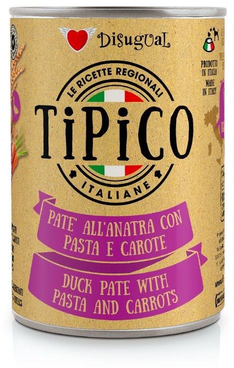 Krmivo pro psy inspirované italskými regionálními recepty. Tipico je kompletní krmivo vhodné pro psy všech velikostí s normální úrovní fyzické aktivity. Receptůra je formulována s 88% zdroji živočišných bílkovin, nakupován od vybraných a zaručených dodavatelů, pocházejících z přebytku produkce určené k lidské spotřebě, s přídavkem zeleniny a vybraného zdroje obilovin. Složení: maso a živočišné deriváty 88% (kachna 30%), zelenina (mrkev 4%), potravinové těstoviny 4%, minerály, cukry. Doplňky na kg: vitamin A 5 000 IU, vitamin D3 333 IU, vitamin E 41 mg, uhličitan železitý 1,58 mg, pentahydrát síranu měďnatého 0,63 mg, oxid manganičitý 7,97 mg , bezvodý jodičnan vápenatý 10 mg, oxid zinečnatý 8 mg, seleničitan sodný 0,014 mg. Analytické složení: vlhkost 81,8%, hrubý protein 8,2%, hrubé oleje a tuky 7,2%, hrubá vláknina 0,4%, hrubý popel 3,0%. Doporučené denní dávkování: Hmotnost psa (kg) Množství (g) 1-5 120-350 10-15 600-850 20-25 1100-1200 30-35 1400-1600 Množství uvedená v tabulce je třeba považovat za orientační. Doporučuje se upravit denní dávku podle skutečných potřeb zvířete. Upozornění: Podávejte při pokojové teplotě. Po otevření uchovávejte v chladničce až 24 hodin. Číslo šarže / Minimální trvanlivost: viz spodní část obalu. Vyrábí se v továrně, která využívá jiné živočišné bílkoviny.