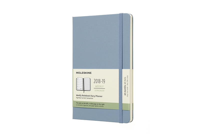 The Moleskine 18-Month Weekly Notebook Diary/Planner runs from July to December. Formatted to show the week's appointments on the left and a ruled page for notes and ideas on the right, this popular planner style is perfect for students, teachers and professionals. - Hard and Soft cover - Rounded corners - Elastic closure - Moleskine ivory-coloured paper - Paper weight: 70 gsm - Useful tools: planning, time zones, international measurements, dialling codes and flight duration - Worldwide Holidays Calendar available from moleskine.com/diaryaddons - Expandable inner pocket matching the notebook color - In case of loss label printed on the flyleaf - Matching ribbon bookmark - Reusable paperband B-SIDE featuring additional printed tools - 180° lie-flat opening