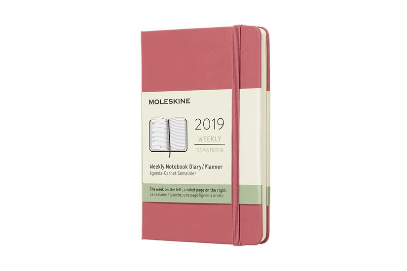 The Moleskine Weekly Notebook is dated from January to December. Formatted to show the week's appointments on the left and a ruled page for notes and ideas on the right, it is a handy and versatile planner that incorporates the freedom of a notebook. - Hard and Soft cover - Rounded corners - Elastic closure - Moleskine ivory-coloured paper - Paper weight: 70 gsm - Useful tools: planning, time zones, international measurements, dialling codes and flight duration - Worldwide Holidays Calendar available from moleskine.com/diaryaddons - Expandable inner pocket matching the notebook color - In case of loss label printed on the flyleaf - Matching ribbon bookmark - Reusable paperband B-SIDE featuring additional printed tools - 180° lie-flat opening