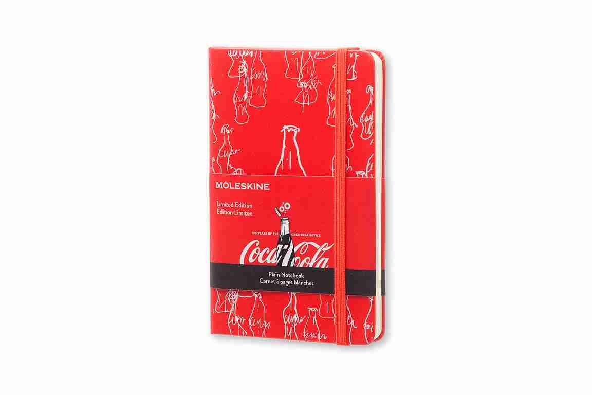 Čistý zápisník limitované edice Coca-Cola. Na červené obálce jsou bílé motivy slavné Coca-Cola lahve. Předsádka je také tematicky vyzdobena. Zápisník má pevnou, ve hřbetu šitou vazbu. Obepíná ho pružná páska proti samovolnému otevírání. Je vybaven praktickou vnitřní kapsou, která je vyrobena z tkaniny a kartonu, a textilní záložkou s letákem s historií Moleskine. Papír s gramáží 70 g/m2 neobsahuje kyseliny. Součástí Coca-Cola edice jsou tematické samolepky.
