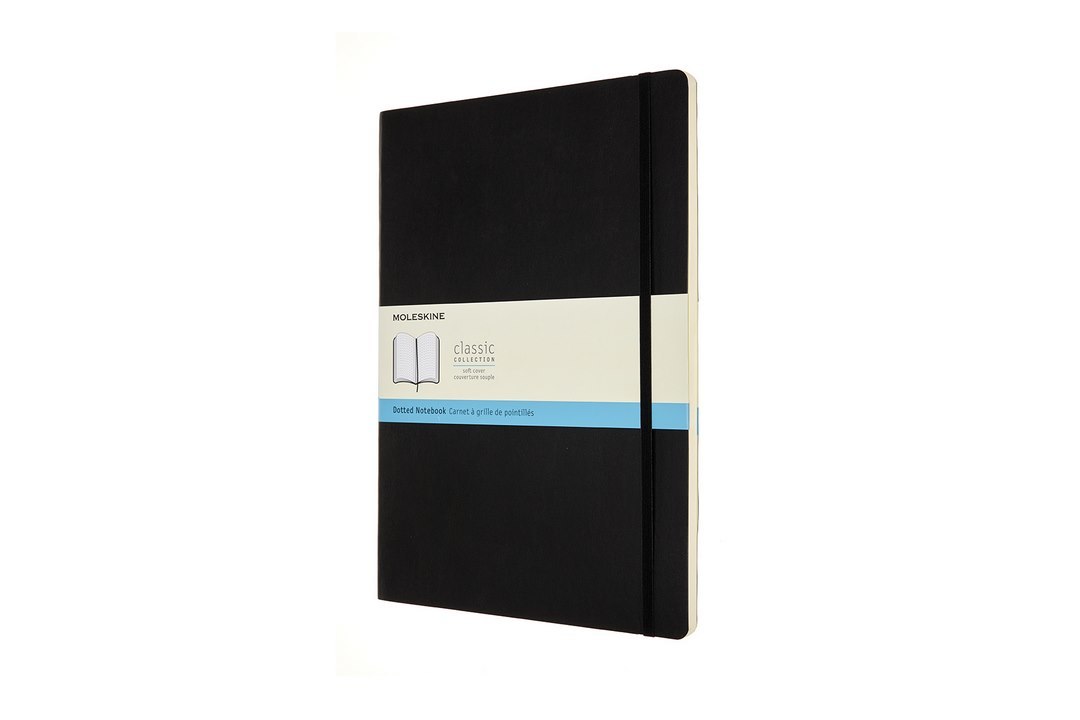 Tečkovaný zápisník velikosti A4 v měkké vazbě. Obepíná ho pružná páska proti samovolnému otevírání. Každý zápisník je vybaven pořadačem poznámek, který je vyroben z tkaniny a kartonu, textilní záložkou a letákem s historií Moleskine. Papír s gramáží 70 g/m2 neobsahuje kyseliny.