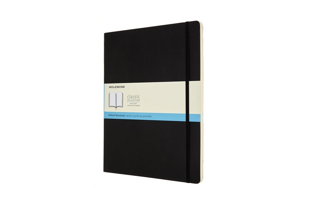 Tečkovaný zápisník velikosti XXL v měkké vazbě. Obepíná ho pružná páska proti samovolnému otevírání. Každý zápisník je vybaven pořadačem poznámek, který je vyroben z tkaniny a kartonu, textilní záložkou a letákem s historií Moleskine. Papír s gramáží 70 g/m2 neobsahuje kyseliny. číst celé