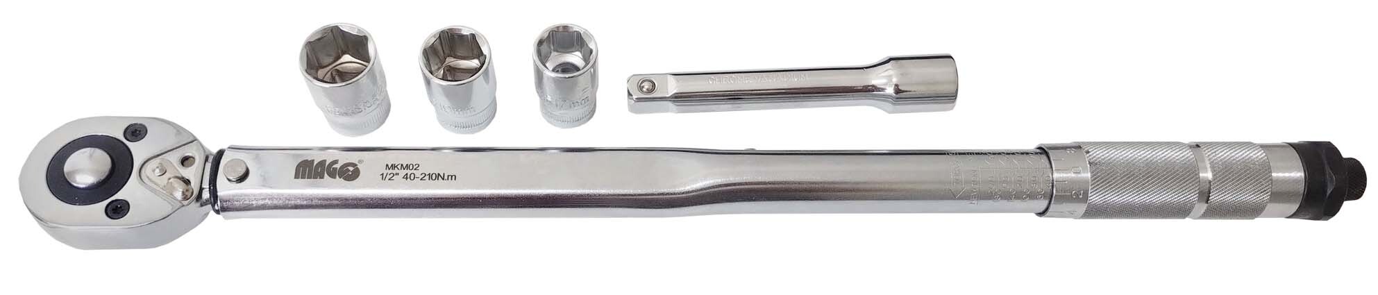 Technické parametry:• Profil výstupu: Vnější čtyřhran s aretací• Velikost profilu výstupu, rozměr v palcích: 1/2“• Točivý moment: 40 - 210 Nm• Přepínací ráčnová hlava• Fixace hodnoty momentu pomocí aretačního šroubu se stupnicí• Délka: 460 mm• Hmotnost ráčny: 1,25 Kg• Kalibrováno: ±4%Vlastnosti:• Materiál: Chrom vanadium - odolný a pevný materiál pro dlouhou životnost• Přepínací ráčna s automatickým uvolňováním: umožňuje snadné utahování a povolování šroubů a matic• Aretace hodnoty momentu pomocí aretačního šroubu se stupnicí: přesné nastavení a udržení požadovaného utahovacího momentu• V plastové pouzdru: pro přehledné uložení a ochranu klíčeSoučástí sady:• Nástavce 17 / 19 / 21 mm• Prodloužení 125 mm• NávodVýhody:• Přesné a spolehlivé měření točivého momentu• Snadné použití• Odolná konstrukce• Obsahuje praktické příslušenství