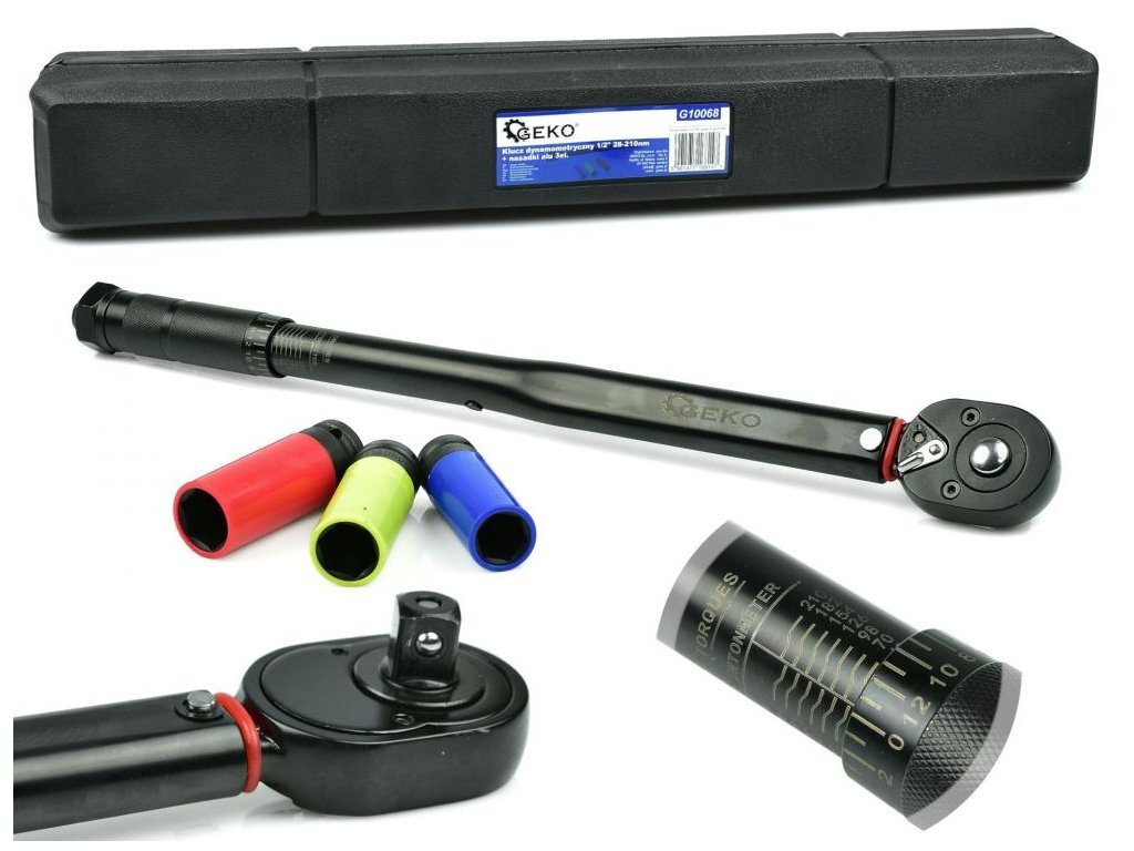 Dynamometrický, momentový klíč 1/2", 28-210Nm s nástrčnými hlavicemi 17, 19, 21mm GEKOSUPER SADA Momentový klíč + nástrčné hlavice 17 mm, 19 mm, 21 mm Nástroj pro profesionální údržbu a opravy vozu, pro utahování matic kol, šroubů hlav válců apod. Momentový klíč určený pro přesné utahování...