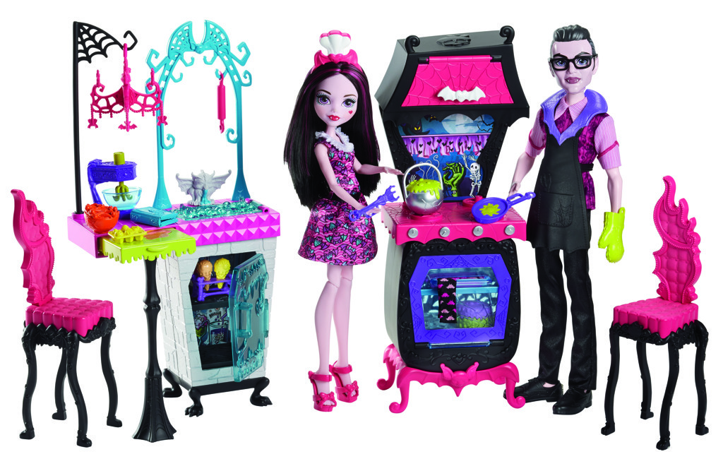 Panenka Draculaura™ a její otec Drákula vaří pekelně dobré jídlo pro rodinu a kamarády ve své nové upíří kuchyni! Tento kuchyňský set Monster High™ je dodáván se všemi ingrediencemi pro skvělou zábavu! Kromě panenky Draculaury™ a Drákuly zde najdeš i nábytek a spousty doplňků. Je tu trouba se sporákem a horní skřínkou, dále také pánvička a bublající hrnec či utěrka. Zvládneš v troubě upéct monstrózní dezert? Zkus například koláče nebo muffiny, určitě ti pomůže funkční šlehač! Pod kuchyňským dřezem s pultem najdeš malou ledničku. Z pultu můžeš udělat stoleček pro Draculauru™ a jejího otce, kteří zde mají i dvě elegantní židle. Dřez je plný bublinek. Odhrň je a umyj v něm nádobí! Na okrasném rámu dřezu i na lustru jsou závěsné háčky, určitě se ti budou hodit na kuchyňské náčiní. Vše je ve stylu Monster High™ s typickými barvami (růžová, fialová, černá), ikonickými nálepkami (měsíc, netopýři či pavučiny) a dekoracemi (rukojeti ve tvaru netopýrů, držáky ve tvaru zvířecích tlap). Draculaura™ s Drákulou mají na sobě fantastické oblečení, které se ideálně hodí na večeři doma nebo večerní zábavu! Aby se při vaření neušpinili, je zde kuchyňská zástěra a chňapka, o kterou se mohou oba hrdinové podělit. Všichni fanoušci Monster High™, budou z průzkumu upírských rodinných vazeb naprosto unesení. Nauč se přijmout to, co tě dělá jedinečnou, spolu se svými bestiálními kamarády z Monster High™. Sesbírej všechny panenky a herní sety Monster High™ a užij si ještě více strašidelné zábavy, protože v Monster High™ je každý vítán! Balení obsahuje oblečené panenky Draculaury™ a Drákuly s doplňky, troubu/sporák, dřez/pult, dvě židle, mixér, kuchyňské nádobí, hrnec, pánev, kuchařskou knihu, jídlo, zástěru, chňapku.