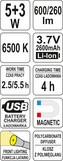 Světlo je opatřeno polykarbonátovou optikou a světelný tok dosahuje hodnot 600/260 lm při barevné teplotě 6500K. Lampa je vybavena silnými magnety ze zadní strany. Může tak stát na rovné podložce, nebo ji lze přichytit na kovovou konstrukci.