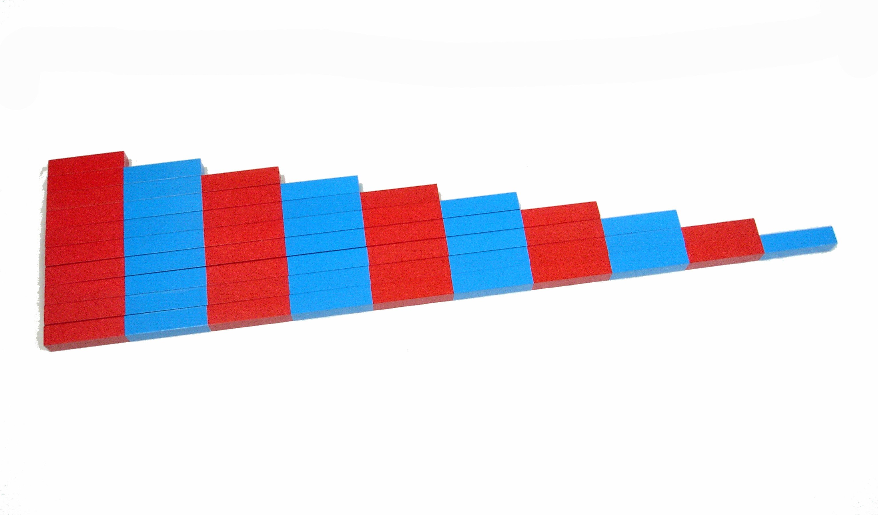 Materiál uvádí dítě do světa množství (1 - 10) a jeho pojmenování. Deset červeno-modrých tyčí dovoluje dítěti prožít (hmatem i vizuálně) kvantitu od jedné do deseti. Rozměr 2,5 x 2,5 x 10-100 cm.. Děti seřazují tyče dle velikosti, osvojují si pojmy jako krátký, kratší, nejkratší, dlouhý, delší, nejdelší. Hezké video o použití tyčí např. zde: