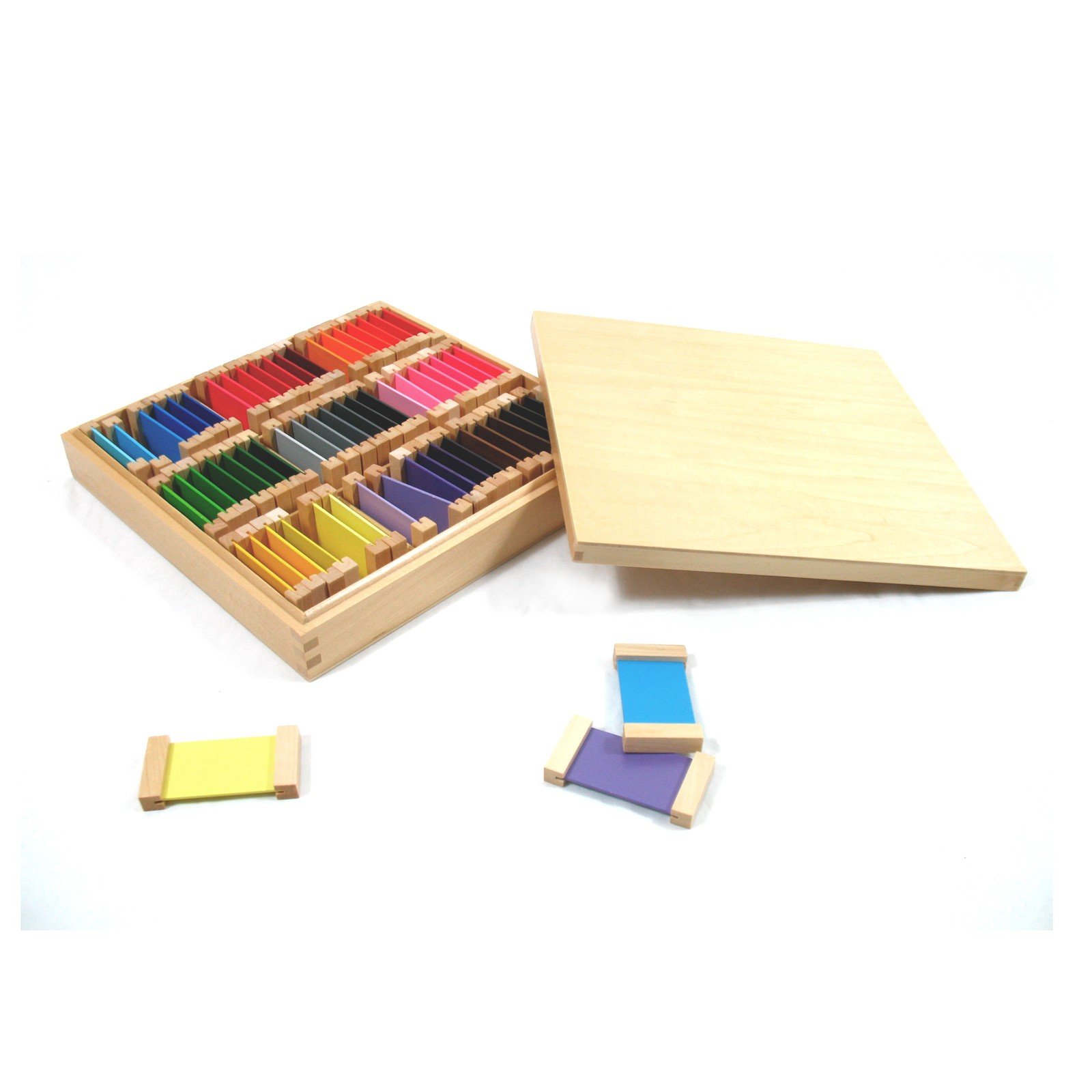 Velká sada 63 barevných destiček. Pokročilý materiál představuje dětem 9 barev a každou v sedmi různě intenzivních odstínech. Dřevěná krabice rozdělena do devíti přihrádek. Každá přihrádka obsahuje jednu barevnou řadu se sedmi destičkami. Jsou seřazené od světlé po tmavou. Destičky jsou zasazené do dřevěných lišt tak, aby vznikl okraj k uchopení. Barvy jsou žlutá červená, modrá, zelená, oranžová, fialová, hnědá, růžová a šedá. Je možné pracovat na koberci. Na stole může dítě pracovat, pokud bude zacházet s málo barvami. Tato pomůcka je určena dětem od 3-4 let. Dítě rozvíjí svůj cit pro barvy. Získá klíč, jak se samostatně orientovat ve světě barev. Postup S touto pomůckou pracujeme zpravidla na koberečku. Pomůcce předchází práce s krabicí č. II. Dítě již bezpečně zná barvy obsažené v krabici II. Doneseme si krabici s destičkami a položíme ji vlevo před sebe. Otevřeme víko, které položíme před krabičku. Zeptáme se dítěte: „S jakou barvou chceš pracovat?“ Vyndáme všechny destičky od vybrané barvy. Položíme je rozházeně před sebe. Krabici zavřeme. Dítěti řekneme: „Zkusíme utvořit řadu od nejsvětlejší po nejtmavší.“ Vybereme nejsvětlejší barvu, pak nejtmavší a jako třetí střední odstín. Dítě necháme spolupracovat. ak přiřazujeme podle odstínů ostatní barvy do řady zleva doprava a od nejsvětlejší po nejtmavší. Přikládáním destičky porovnáváme. Chybuje-li dítě, tak ho neopravujeme! Necháváme dítě pracovat s další barvou, kterou si vybere. Pokud by dítě chybovalo i podruhé, tak jej beze slov opravíme. U třetí krabice děláme též třístupňovou lekci. Po skončení práce krabičku uklidíme na místo. Kontrola správnosti Správnost si dítě může ověřit zrakem. Kontrola chyb je možná pouze v případě, kdy je dítě schopné rozlišovat barvy a jejich odstíny. Další cvičení -Seřadit tabulky jedné barvy od nejtmavší k nejsvětlejší -Seřadit tabulky jedné barvy od nejsvětlejší k nejtmavší. -Ze sestavené řady se vezme jedna tabulka a mezera se uzavře. Dítě má odhalit místo, ve kterém došlo k barevnému skoku. -Vytvořit hvězdu (slunce) - uvnitř tmavou, vně světlou. -Vytvořit spirálu, začít všemi nejsvětlejšími tabulkami, pokračovat o odstín tmavšími. Poznámka Tato cvičení kladou vysoké nároky na rozpoznávací a rozlišovací schopnosti. Je proto vhodné dělat je ve dvojicích nebo ve skupinách. Nechat děti spolupracovat. Po cvičení s krabicí III začne dítě popisovat barvy od světlé po tmavou. Stupňování u jednotlivých barev.