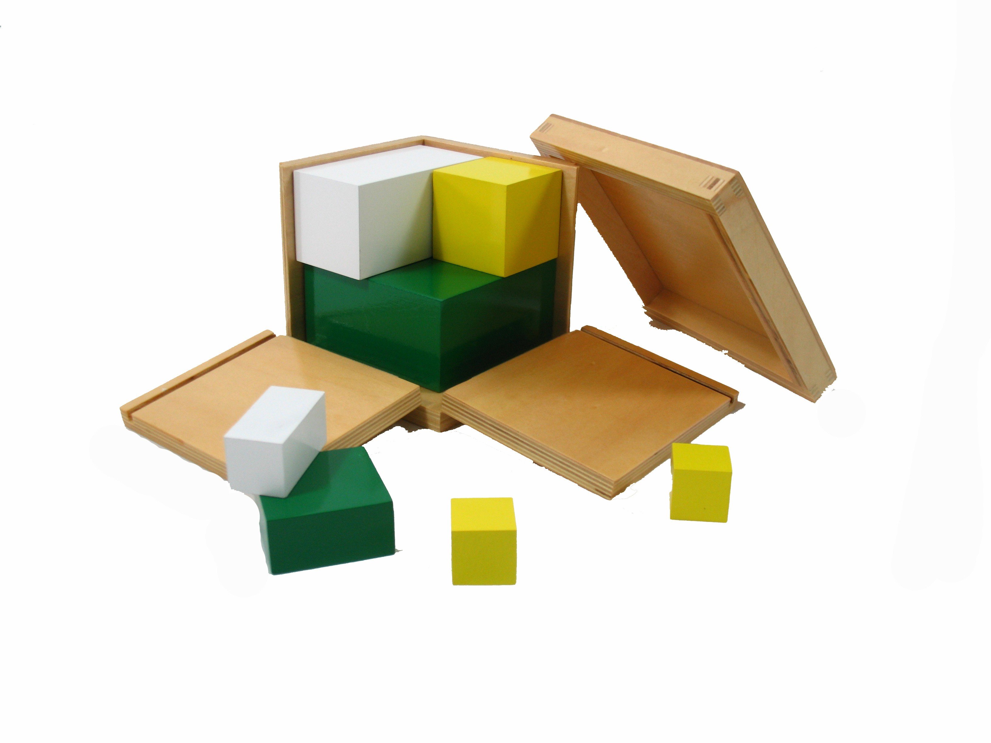 Materiál pomocí svých částí (krychle a hranoly) demonstruje druhou mocninu. Krychle je v dřevěné krabičce.