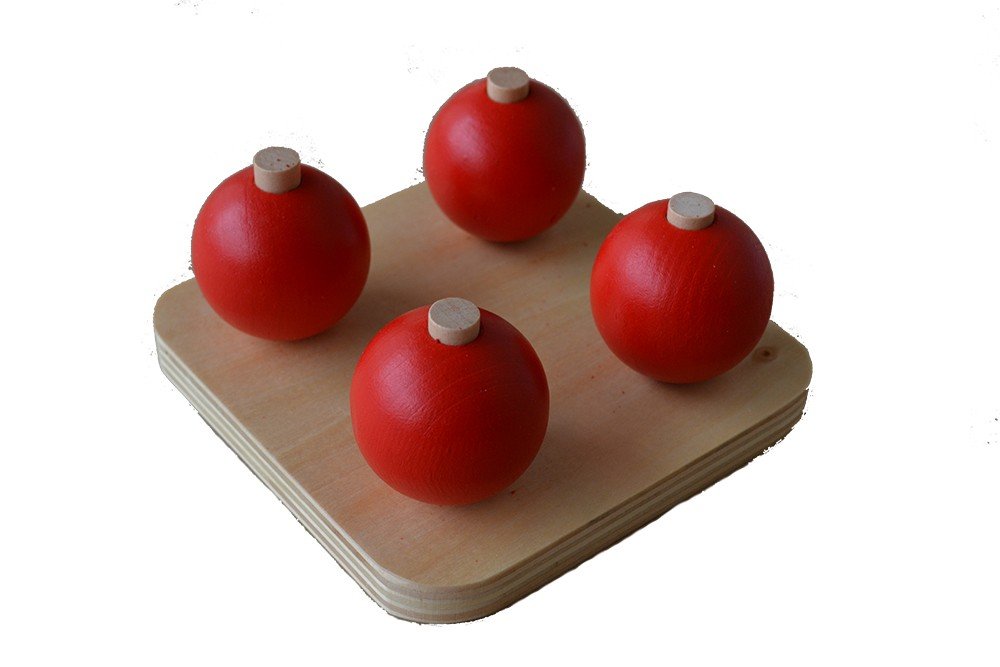 Čtyři dřevěné červené koule se nasazují na čtyři kolíky ze světlého dřeva. číst celé