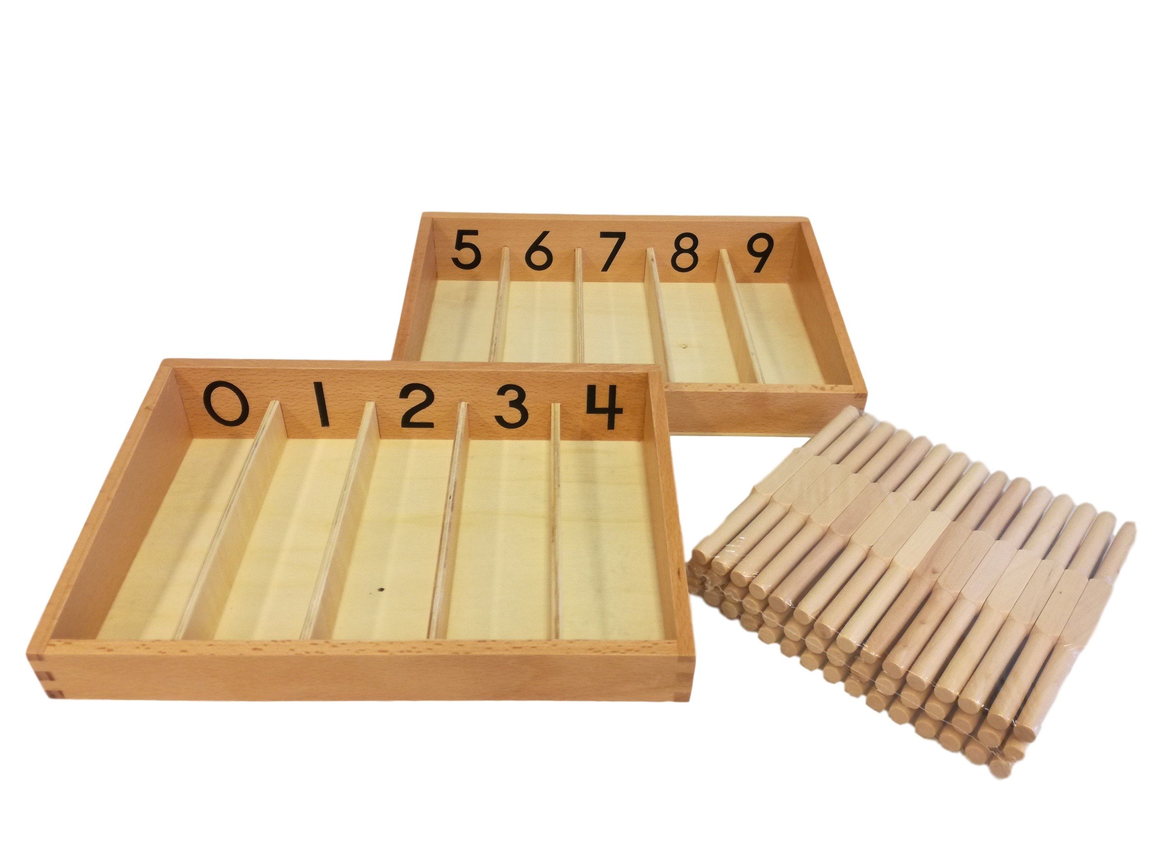 Popis pomůcky: -matematická pomůcka -dvě dřevěné krabice rozdělené vždy na 5 dílů; každá část má na zadní stěně číslo od 0 do 9 -dřevěná vřeténka (45 ks) Přínos pomůcky: -určování množství 0 až 9 -seznámení s číselnou řadou 1 až 9 -zavedení nuly -jemná motorika Práce s pomůckou: Přeneste pomůcku na kobereček nebo na stůl a vřeténka položte vpravo vedle krabic. Upozorněte dítě na čísla, která jsou u každé přihrádky a nechte ho je přečíst. Můžete mu říci, že tato čísla nám říkají, kolik máme dát vřetének do každé přihrádky. Seznámení s nulou Zda dítě aktivitu zvládlo, ověříte dotazováním na počet vřetének v jednotlivých částech krabice. Následně ukažte na oddíl označený nulou. „Kolik je tu vřetének?“. Dítě odpoví „Žádné“. Nastal čas k vysvětlení: „To je nula“. Ukažte na číslo jedna, nechte dítě číslo přečíst a řekněte: „do této přihrádky dáme jedno vřeténko“. Takto pokračujte až do čísla čtyři a zbylá nechte na dítěti, aby dodělalo. Dominantní rukou berte vřeténka, pokládejte do druhé ruky, pevně sevřete a teprve nyní vyslovte číslo, kolik vřetének držíte. Při ukládání vřetének do příslušného oddílu v krabici počítejte nahlas (kontrola). Spočítaná vřeténka je možné svazovat provázkem, gumičkou, drátkem, apod. (propojení s činnostmi z Praktického života). Kontrolou správného provedení je spotřebování všech vřetének. Jestliže nějaké chybí nebo přebývá, máme někde chybu. Nyní můžete dítě vyzvat, aby ještě jednou nahlas spočítalo vřeténka v jednotlivých odděleních, příp. praktikujte třístupňovou metodu („to je…“, „podej mi….“, „kolik je…?“) Hra na nulu Tuto hru je možné hrát na elipse s dětmi, které už znají číslice. Děti si losují ze sáčku lístečky, na nichž jsou napsána čísla od nuly do devíti. Na základě tohoto údaje si do nádobky berou odpovídající počet předmětů (bonbony, korálky, apod.). Nula dostává význam. I když si žádný předmět dítě nebere, zjišťuje, že nula je součástí číselné řady. Hra na robota Dospělý „přečaruje“ dítě na robota na dálkové ovládání a dává mu pokyny: -Poskoč dvakrát, pětkrát, nulkrát … -Tleskni osmkrát… -Doběhni třikrát ke dveřím…. -Mrkni šestkrát… -Podej mi pět kolíčků, atd. Role se samozřejmě následně otočí. Hra na obchod Dítě je prodavač a prodává vřeténka v počtu požadovaném zákazníkem - rodičem/jiným dítětem. Další varianty Vřeténka je možné používat společně s Červeno-modrými tyčemi. Každý dílek na tyči odpovídá jednomu vřeténku. Následuje seznámení a spojení se Smirkovými číslicemi.