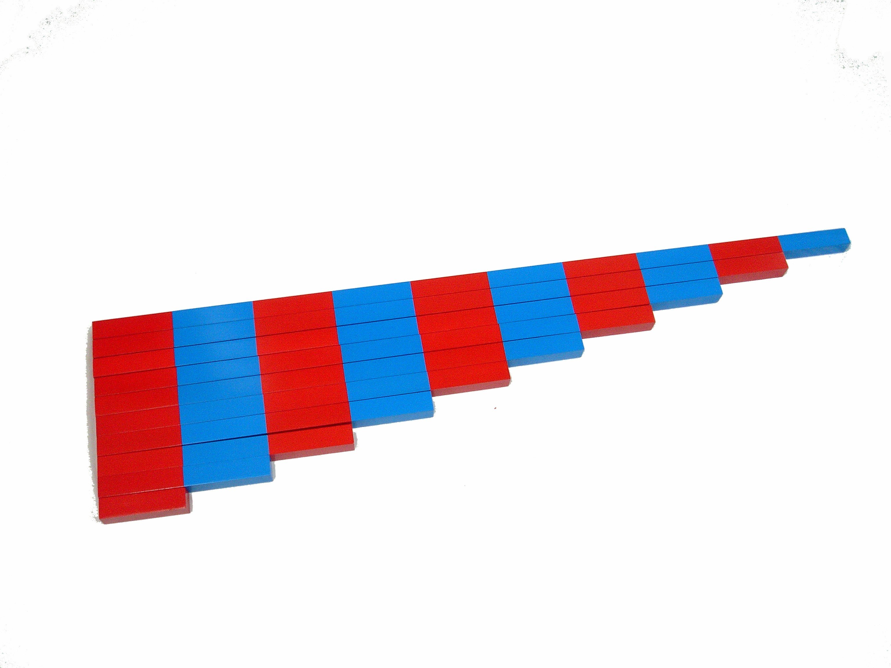 Pomůcka uvádí dítě do světa množství (1 - 10) a jeho pojmenování. Deset červeno-modrých tyčí dovoluje dítěti prožít (hmatem i vizuálně) kvantitu od jedné do deseti. Rozměr 2,5 x 2,5 x 10-100 cm.. Děti seřazují tyče dle velikosti, osvojují si pojmy jako krátký, kratší, nejkratší, dlouhý, delší, nejdelší. Seznámení s pomůckou Přeneste tyče na kobereček. Uchopení je stejné jako u červených tyčí - prsty za boční strany (vnímání délky). Pokud je tyč pro dítě příliš dlouhá, předvedeme dítěte svislé držení tyče s lokty u těla. Pohybujte se tiše a pomalu. Tyče můžete na koberečku rozmístit libovolně a rovnat je podle délky (buď na stejném nebo druhém koberečku). Správnost pořadí překontrolujte pomocí nejkratší (červené) tyče. Nyní můžeme dítěti říct „Stejně jako ty máš svoje jméno, i tyto tyče se každá nějak jmenují. Chceš vědět jak?“. Pokládejte dlaň na jednotlivé dílky a počítejte nahlas. Příklad: „Jedna, dvě, tři.“ Uchopte pevně tyč a řekněte: „To je Tři.“ Dítě po vás opakuje. Jakmile tento krok dokončíte, promíchejte tyče a vyzvěte dítě: „Podej mi prosím tyč Čtyři.“, „Podej mi prosím tyč, která následuje.“, „Podej mi prosím tyč, která je před ní.“, apod. Tyče můžete skládat podle různých vzorců - od nejkratší po nejdelší, od nejdelší po nejkratší, od prostřední. Dbejte však na to, abyste použili vždy všechny tyče, neboť tvoří celek. Třetím krokem je dotazování: „Jak se jmenuje tato tyč?“ Práce ve skupině Je-li dětí více, vybere si každý jednu tyč. Podle délky tyče řekne své jméno: „Já jsem jednička“, „Já jsem pětka“, atd. Děti nejdříve trénují přenášení tyčí - např. soustředěnou chůzí po elipse. Následně mohou děti začít hrát hru, při které hledají svého souseda, až nakonec stojí všechny v řadě a jiné dítě nebo učitel počítají nahlas dílky na tyčích a provádějí kontrolu. Další možnosti: -„Udělej tolik kroků, kolik je dílků na tvé tyči. A zpět!“ -„Dupni u každého modrého dílku (sudá číslice). A zpět!!“ -„Povyskoč u každého červeného dílku (liché číslice). A zpět!“ Trénink paměti: Jsme ve vedlejší místnosti a pošleme dítě např. pro tyč č. 5. Jakmile jsou tyče všechny opět srovnané. Vyzveme dítě, aby zavřelo oči nebo se otočilo a schováme si jednu tyč za záda. Dítě hádá, která chybí. Časem je možné odebrat i více tyčí současně. Další varianty práce s Červeno-modrými tyčemi -přiřazování kartiček s odpovídajícími číslicemi příp. Smirkovými číslicemi. -skládání tyčí do různých obrazců dle fantazie dítěte nebo podle vzorových kartiček -porovnávání tyčí (delší x kratší / více x méně); později lze doplnit o znaménka < a > -měření délky: Jak dlouhá je postel, stůl… Jak široký je chodba, pokojíček,... -děti rády používají tyče ve svislé poloze (opírají se o ně jako o hůl, bojují jako s mečem, apod.). Zkuste přesměrovat jejich pozornost na měření výšky: Která tyč mi sahá po koleno, která po pupík, která do podpaží, apod. Jak vysoký je sourozenec? Kolik tyčí potřebujeme, abychom změřili tátu? Když už dítě ovládá počítání dílků na tyčích, vyzveme ho, aby pojmenovávalo pouze červené dílky (u modrých mlčí). A poté naopak pouze modré (u červených mlčí) => SUDÝ x LICHÝ V pokročilejší fázi lze prodloužit tyč č. 10 na 11, 12, 13, atd. a opět lze sčítat a odčítat, hledat liché a sudé, apod. Práci s tyčemi můžete doplnit pracovními listy. Vždy je ale třeba postupovat od konkrétního k abstraktnímu, tj. nejdříve umožnit dítěti práci a prožitek s tyčemi (svalová paměť) a poté teprve přejít k práci na papíře. Hezké video o použití tyčí např. zde:
