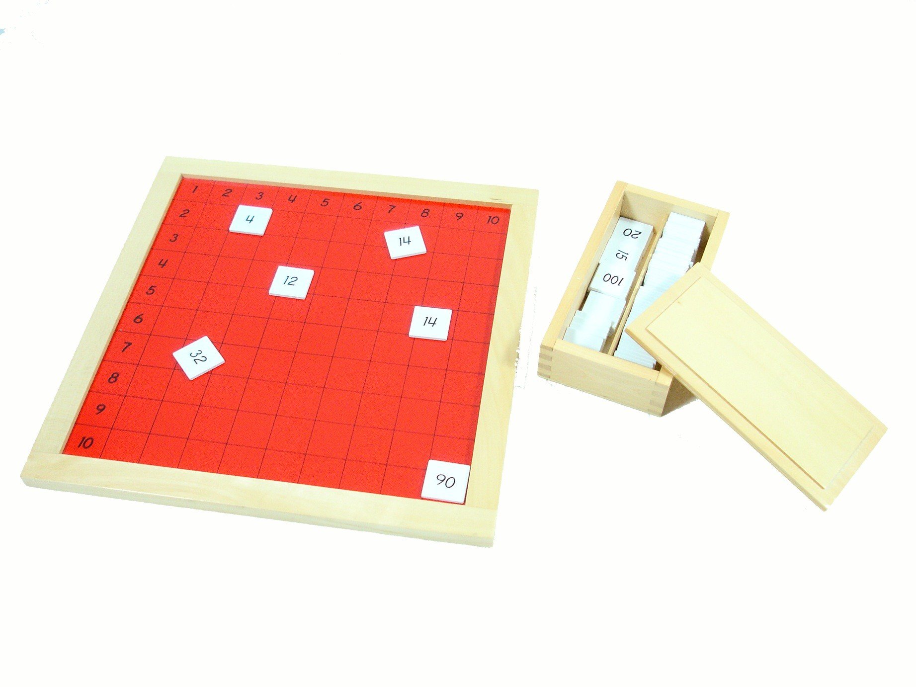 Tabulka pro procvičování násobení čísel od 1 do 10. Materiál obsahuje prázdnou červenou tabulku 10 x 10 a krabičku se stovkou dřevěných čtverečků s čísly (1 - 100). číst celé