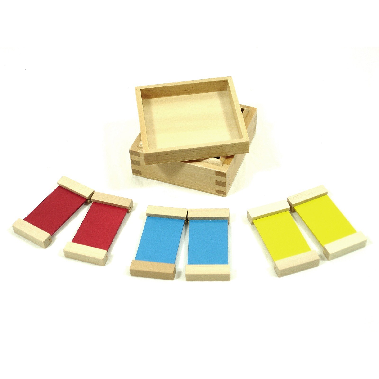 Krabička se třemi páry barevných destiček (základní barvy - žlutá, modrá, červená) slouží k poznávání barev, jejich pojmenování a přiřazování do páru. Destičky jsou zasazené do dřevěných lišt tak, aby vznikl okraj k uchopení. Tato pomůcka je určena dětem od 3 let. Dítě rozvíjí svůj cit pro barvy. Získá klíč, jak se samostatně orientovat ve světě barev. Postup: 1) S touto pomůckou můžeme pracovat jak na podložce u stolu, tak i na zemi na koberečku. 2) Doneseme si krabici s destičkami a položíme ji vlevo před sebe. Otevřeme víko, které položíme před krabičku. 3) Vyndáme barevné destičky a položíme je rozházeně před sebe. 4) Dbáme na správný úchop destičky! Vždy za dřevěný okraj, barevné plochy se nedotýkáme. 5) Krabici zavřeme. 6) Poté hledáme páry - stejné barvy. Páry rovnáme před sebe zleva doprava. 7) Pokud jsme spárovali všechny barvy, tak destičky uklidíme zpět do krabičky. 8) Krabičku uklidíme na místo. 9) Při další práci pojmenováváme barvy - "to je červená, to je…".. "ukaž červenou, přikryj modrou…". Kontrola správnosti: Správnost si dítě může ověřit zrakem. Kontrola chyb je možná pouze v případě, kdy je dítě schopné rozlišovat barvy. Poznámka Pro práci s barevnými destičkami jsou nutné dobré světelné podmínky. Pokud jsou barvy seřazeny pod sebou, okraje jasně oddělují jednotlivé barvy. Při nošení krabice dbáme na to, abychom dítěti ukázali, jak přidržujeme víko krabice palci. Cvičení -Další aktivity bychom dětem měli ukázat, až když dítě získá zkušenost v manipulaci s materiálem a je schopné zrakem rozlišovat barvy. -Hledání párů - dítě přiřazuje k destičkám předměty ze třídy ve stejné barvě.