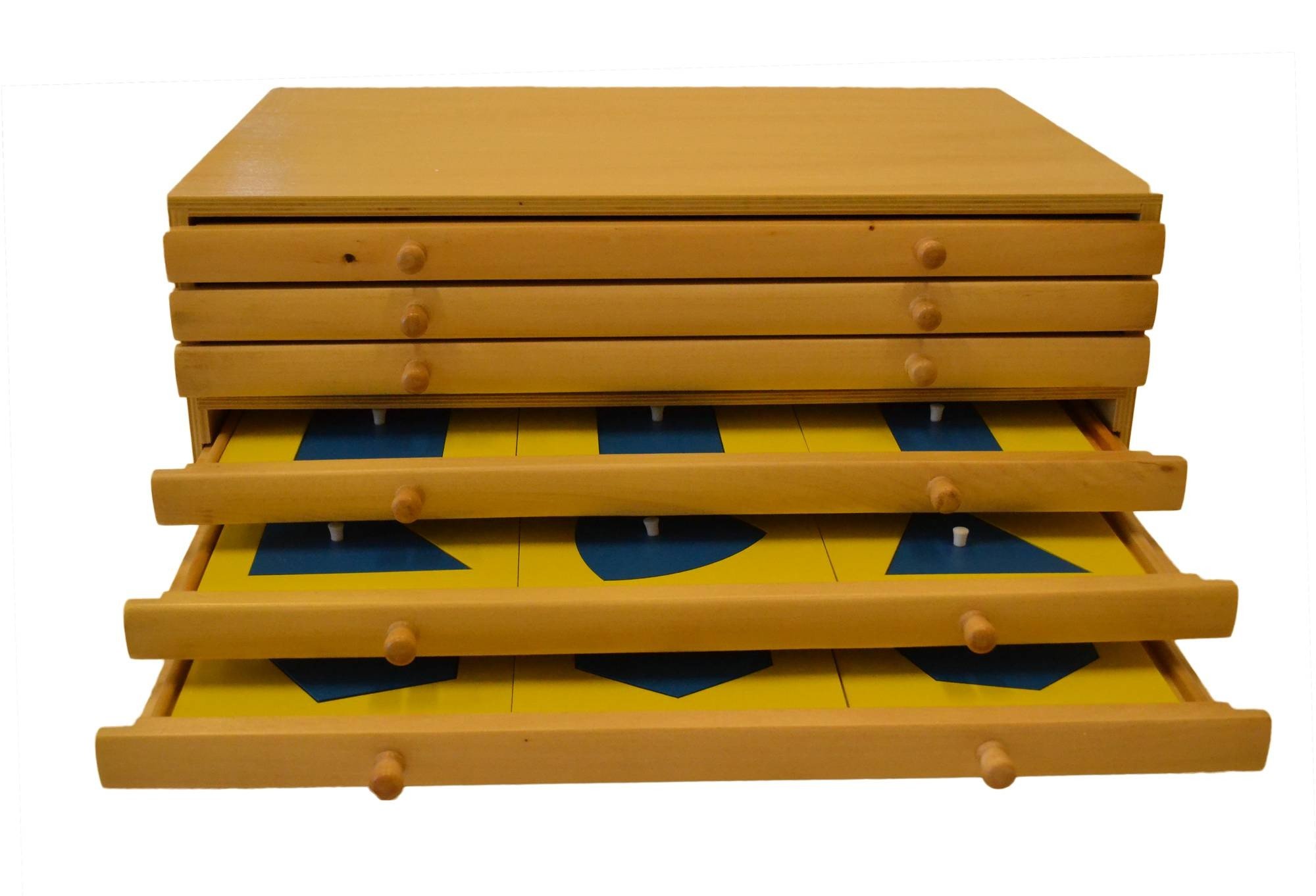 Dřevěná geometrická komoda se 6 zásuvkami, které obsahují 35 rovinných tvarů: „tvar“ a jemu odpovídající „rámeček“.