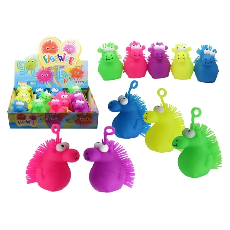 Svítící 10cm natahovací mořský koník. Možnost výběru z pěti barev - žluté, modré, zelené, fialové nebo růžové. Nevhodné pro děti do 3 let.