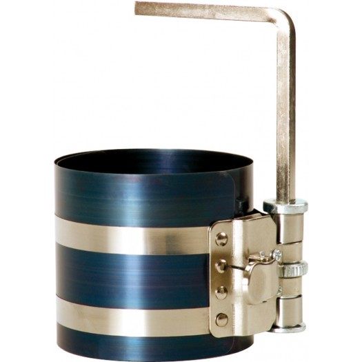 Svěrka na pístní kroužky 100 mm vysoká. Ovládání klíčem s ráčnovým mechanismem a bezpečnostní ventil spojují rychlé a bezpečné sevření se spolehlivým ovládáním. Svěrka jemně stiskne kroužky do jejich pracovní plochy, čímž sníží nebezpečí poškození komponentu při instalaci.