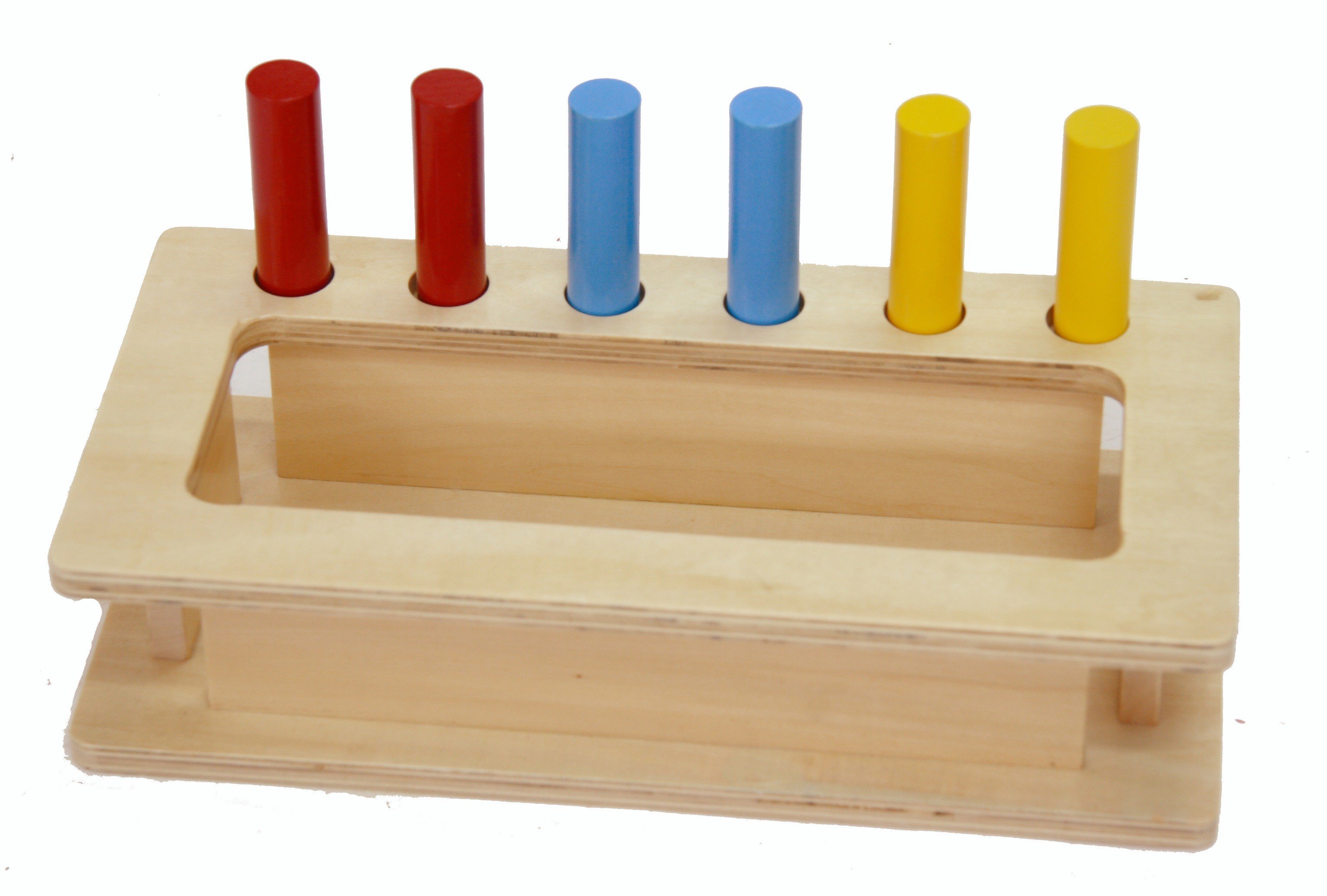 Set dřevěných válečků (2 modré, 2 žluté, 2 červené) děti vkládají do otvorů, čímž procvičují svoji motoriku a kooordinaci oka a ruky. Možno využít i k poznávání barev, k třídění atd.