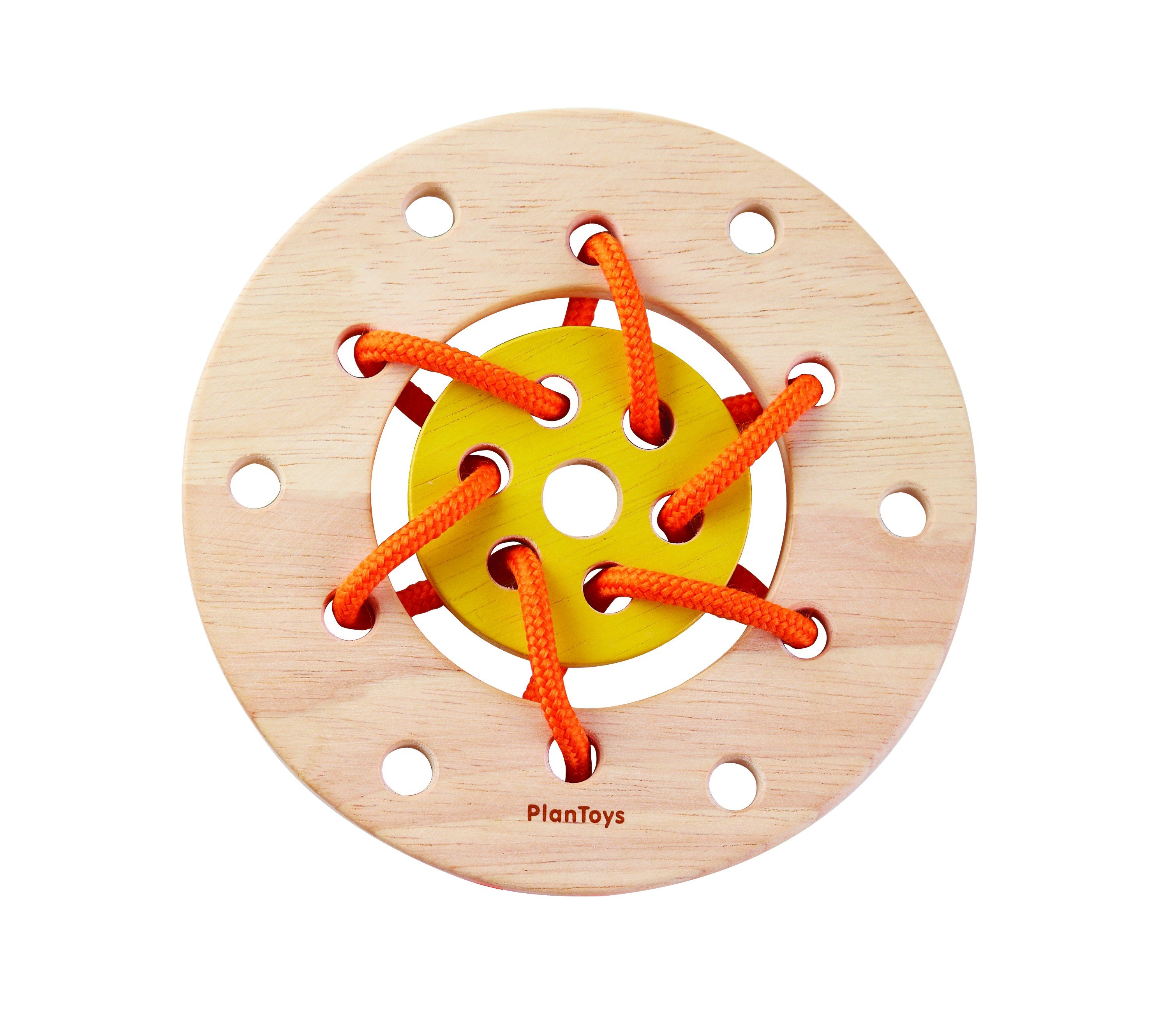 Děti se budou bavit při vytváření modelu šněrovacího kolečka, které jim pomáhá rozvíjet jemné motorické dovednosti a koordinaci ruka - oko, stejně jako posiluje jejich kreativitu. Rozměry: Ř 12.3 x 0.8 cm Vhodné pro děti od 3 let. PLAN TOYS Plan Toys je již více než 30 let úspěšně fungující firma v oboru výroby vysoce kvalitních ekologických hraček. Firma vznikla v roce 1981 na jihu Thajska a v této oblasti funguje dodnes. Ve své produkci využívá dřevo z kaučukovníků, které již neprodukují latexové mléko. Společnost toto dřevo vykupuje od farmářů, pro které již nemá žádnou hodnotu, ale rovněž dbá na to, aby byly opětovně vysazovány stromy nové. Právě použitím těchto stromů, je výroba trvale udržitelná, ekologická a navíc z vysoce kvalitního materiálu. Výrobní proces je navržen tak, aby se za využití solární energie a biomasy maximálně šetřila energie a nedocházelo k žádné produkci odpadu. PlanToys používá ve své výrobě hraček lepidlo bez formaldehydů a barvy na vodní bázi, které jsou bezpečné, bez olova a jiných těžkých kovů. Pro obaly a tištěné materiály se využívá recyklovaný papír. Hračky mají certifikáty potvrzující ekologicky šetrné, sociálně prospěšné a ekonomicky životaschopné obhospodařování lesů a ISO 9001 (pro vysokou kvalitu produktů) a 14001 (management životního prostředí). Firma získala akreditaci o sociální odpovědnosti (OHSAS 18001), což vypovídá o perfektním vztahu k zaměstnancům a vytváření bezpečného a zdravého pracovního prostředí. Firma zaměstnává mimo jiné také osoby se zdravotním postižením, pravidelně sponzoruje mnoho aktivit pro děti, jako jsou dětské kluby, hřiště, knihovny a herny, ale dokonce i spolupracuje s maminkami dětí s různým postižením a spolu s nimi vytváří hračky, které mohou těmto dětem pomoci. Hračky od PlanToys podporují hru, kreativní mysl a učí děti o světě kolem nás. O jejich úspěchu vypovídají také desítky ocenění z celého světa.