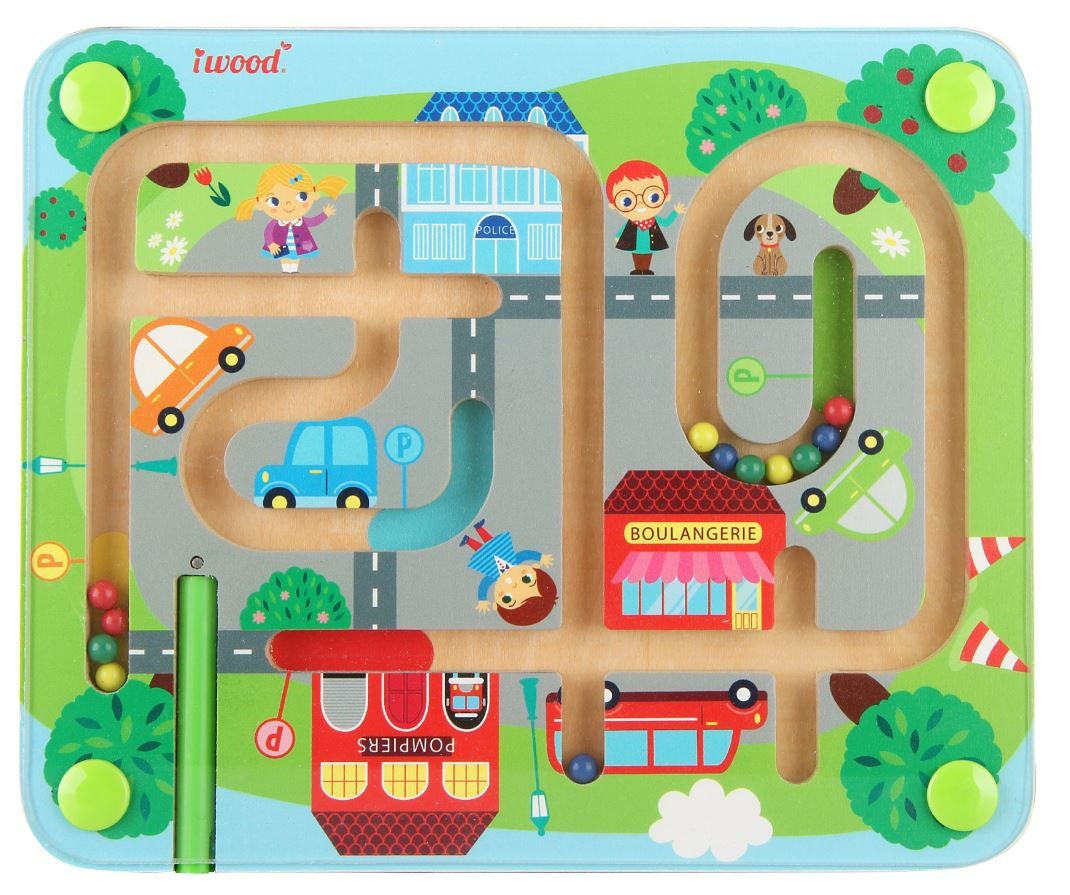 Labirynt magnetyczny samochody Drewniany labirynt magnetyczny to innowacyjny sposób na ćwiczenia ruchów precyzyjnych dziecka. Za pomocą rysika magnetycznego zawartego w zestawie maluch może próbować przesuwać kuleczki, które znajdują się za przezroczystą szybką i starać się przenosić je po trasie w wybrane miejsca.