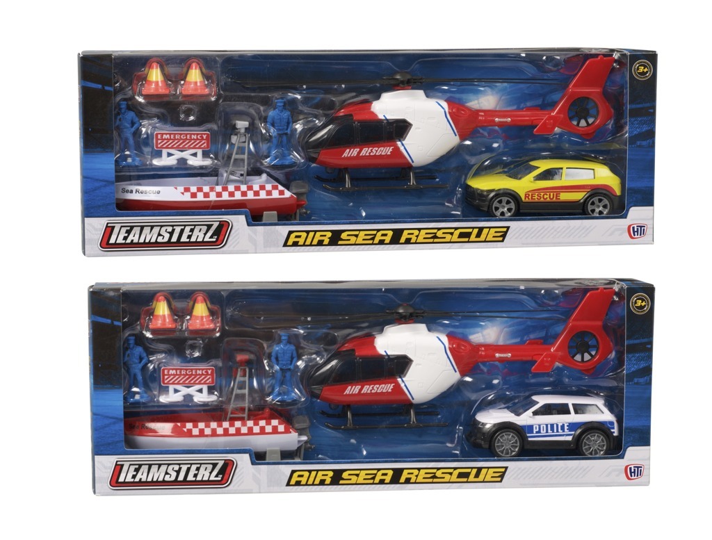 Teamsterz záchraný námořní set obsahující záchranou helikoptéru, člun, automobil, 2 figurky námořníka, varovné cedule a kužely. Výběr z dvou designů. číst celé