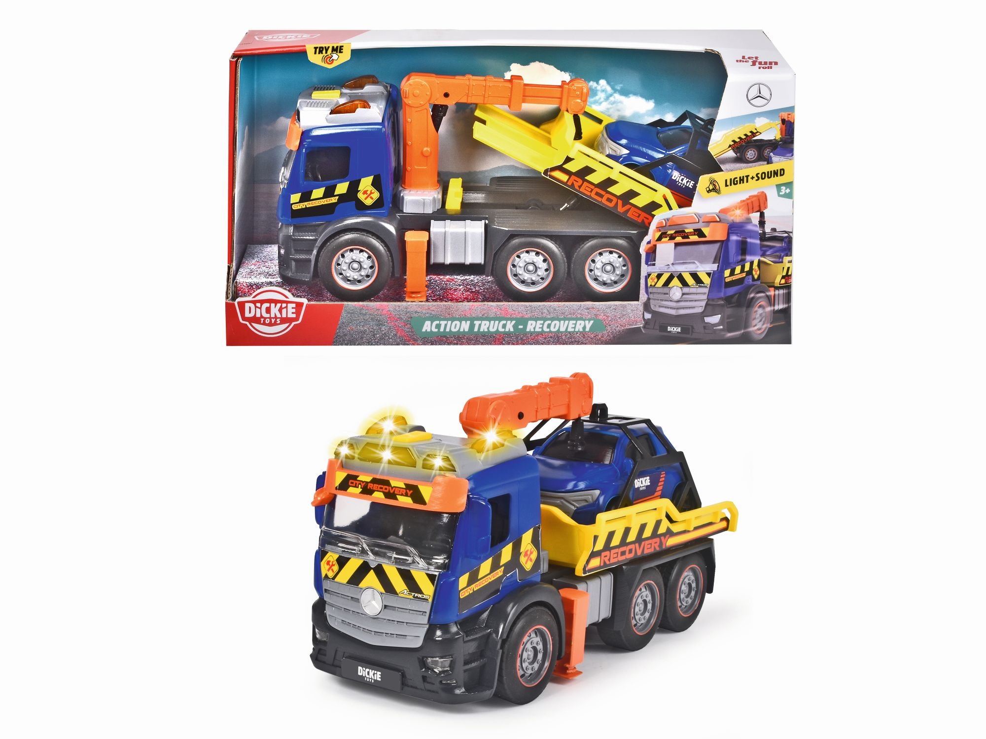 Odtahový vůz Mercedes na setrvačník se světelnými a zvukovými efekty a pohyblivými díly, délka 26 cm. Součástí osobní auto na volnoběh, 12 cm. číst celé