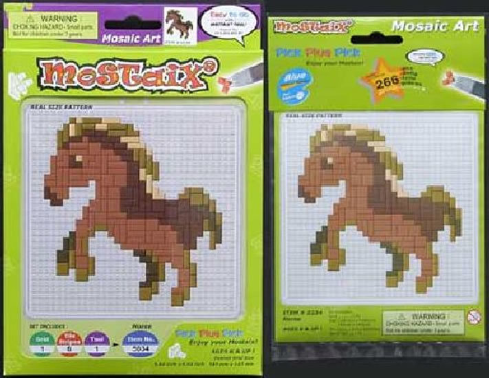 Kreativní hračka pro děti - MOZAIKA KŮŇ. Vytvoř si obrázek lehce a jednoduše s pomocí přiložené šablony. Pomocí přiloženého nástroje si z dílků sestavíš pěkný mozaikový obrázek. Dílky od pásku odděluj kroucením a umísti je na mřížku položenou na předloze. Jen to zkus a uvidíš! Set obsahuje: 1x mřížku, 6x pruh s dílky, 1x pracovní nástroj, 1x předloha, 1x stojánek. Rozměry balení: 17 x 24.80 x 1.40 cm. Určeno pro děti od 6 let. Nevhodné pro děti do 3 let.