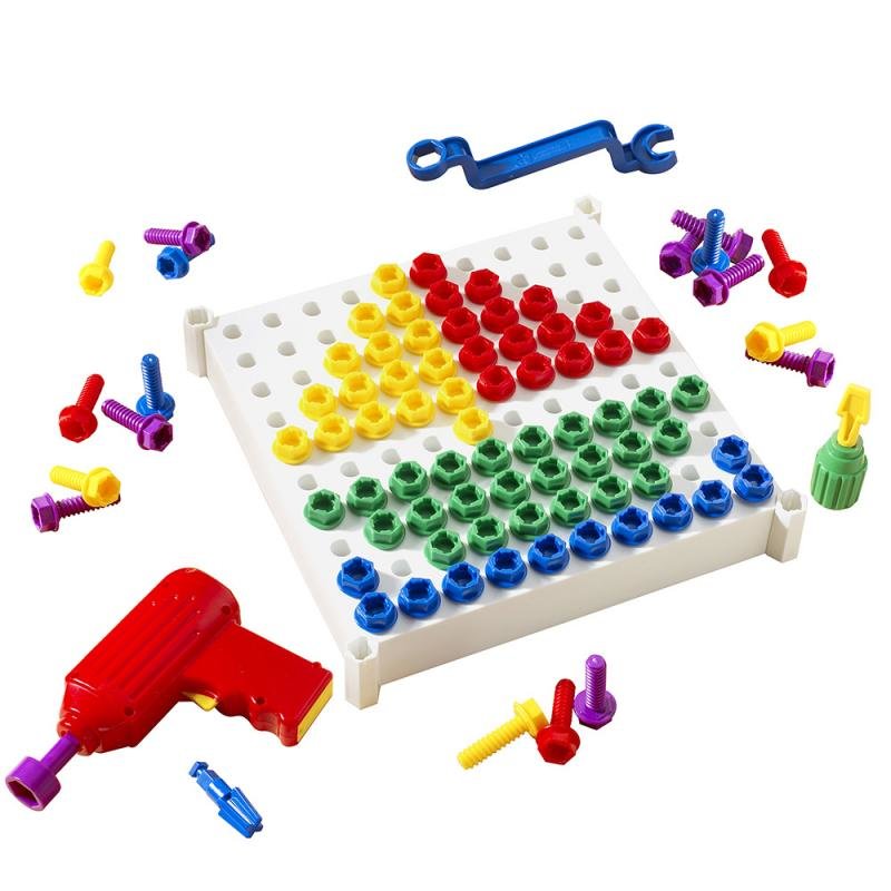Velká kreativní stavebnice pro děti od 3 do 7 let. Tvořivá šroubovací mozaikou, nenechá dětské ruce zahálet při tvorbě různých vzorů z velkých barevných šroubů. Sada obsahuje funkční el.šroubovák i ruční nářadí a různé nástavce pro pestré zábavné hraní. Spousta barvených předloh pomůže dětem ve tvoření, hlavně na začátku používání. Rozvíjí dětské schopnosti rozeznávání barev a jejich jemnou motoriku. Děti budou milovat pestrobarevné vzory a zvuky opravdového funkčního šroubováku. Vyzkouší si jaké to je pracovat s opravdovým, ale bezpečným nářadím. Důležitá je také možnost udržovat hračku hygienicky čistou, díky kvalitním plastovýcm materiálům. Sada obsahuje mnoho vzorů od základních tvarů po složitější, kde si děti vyzkouší poznávání barev. Při sestavování vzorů se zároveň učí počítat, aby barevné šrouby zapadly přesně na správné místo a vytvořily vybraný tvar nebo vzor. Vzory jsou na velkých laminovaných kartách, které se snadno čistí. Poslední karta obsahuje slepý bílý vzor, který můžete využít pro vytvoření vlastní předlohy podle vaší fantazie a děti se obrázek mohou pokusit sami ze šroubů sestavit. Pro potrénování ručiček, zlepšení jejich koordinace a jemné motoriky poslouží manuální šroubovák, který je součásí sady, do kterého lze zasunout všechny 3 nástavce z vrtačky. K utažení šroubů mohou děti využít i velký plastový klíč. Malí kutilové se tak seznámí a vyzkouší si práci instalatérů, truhlářů nebo jiných řemeslníků s různými nástroji. Rozměr hrací desky pro skládání obrázků je 28x28 cm a obsahuje 100 otvorů. Díky více druhům montážního nářadí si s celou sadou může hrát více dětí a spolupracovat, což je bude bavit ještě víc. Při společné práci na sestavování vzorlů se učí základům komunikace a mohou si rozdělit úkoly (Díky více druhům montážního nářadí si s celou sadou může hrát více dětí a spolupracovat, což je bude bavit ještě víc. Při společné práci na sestavování vzorlů se učí základům komunikace a mohou si rozdělit úkoly Díky více druhům montážního nářadí si s celou sadou může hrát více dětí a spolupracovat, což je bude bavit ještě víc. Při společné práci na sestavování vzorlů se učí základům komunikace a mohou si rozdělit úkoly (např. zavrtat každý jinou barvu šroubů), aby jim šla práce lépe od ruky. Děti se baví a zároveň učí: - rozeznávat barvy - počítat - logickému myšlení - tvořivosti - zlepšit motoriku a zručnost Šroubovací mozaika Kouzelný šroubovák® patří mezi nejoblíbenější hračku v anglických školkách. Věk: 3 - 7 let BALENÍ OBSAHUJE: 1 elektrická vrtačka 3 vrtací nástavce (plochý, křížový, maticový) 120 plastových šroubů (v 5 barvách) 1 pracovní deska 20 barevných karet s předlohou Rukojeť šroubováku Oboustranný klíč Český a slovenský návod Výrobek vyžaduje 3x AA baterie (nejsou součástí balení)