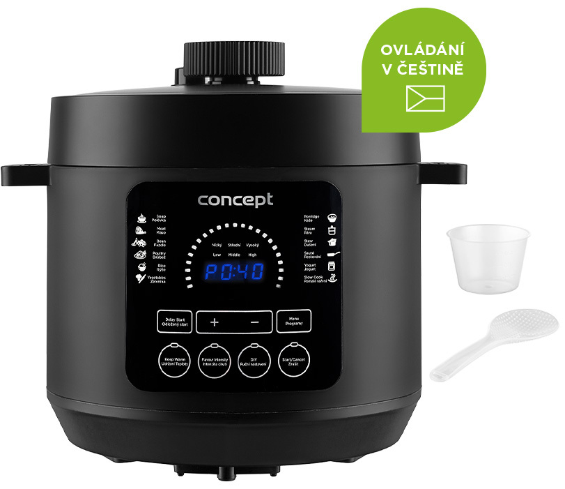 Multifunkční tlakový hrnec nabízí 12 přednastavených programů (polévka, maso, fazole, drůbež, rýže, zelenina, kaše, pára, dušení, restování, jogurt a pomalé vaření), které usnadňují přípravu pokrmů. K dispozici je také manuální režim, funkce pro udržování teploty Keep Warm a možnost nastavení odloženého spuštění. Disponuje ovládacím panelem v češtině, což značně usnadňuje jeho používání. Díky jednoduchému rozhraní v rodném jazyce nastavíte všechny potřebné funkce rychle a bez problémů, aniž byste museli řešit složité překlady nebo návod.