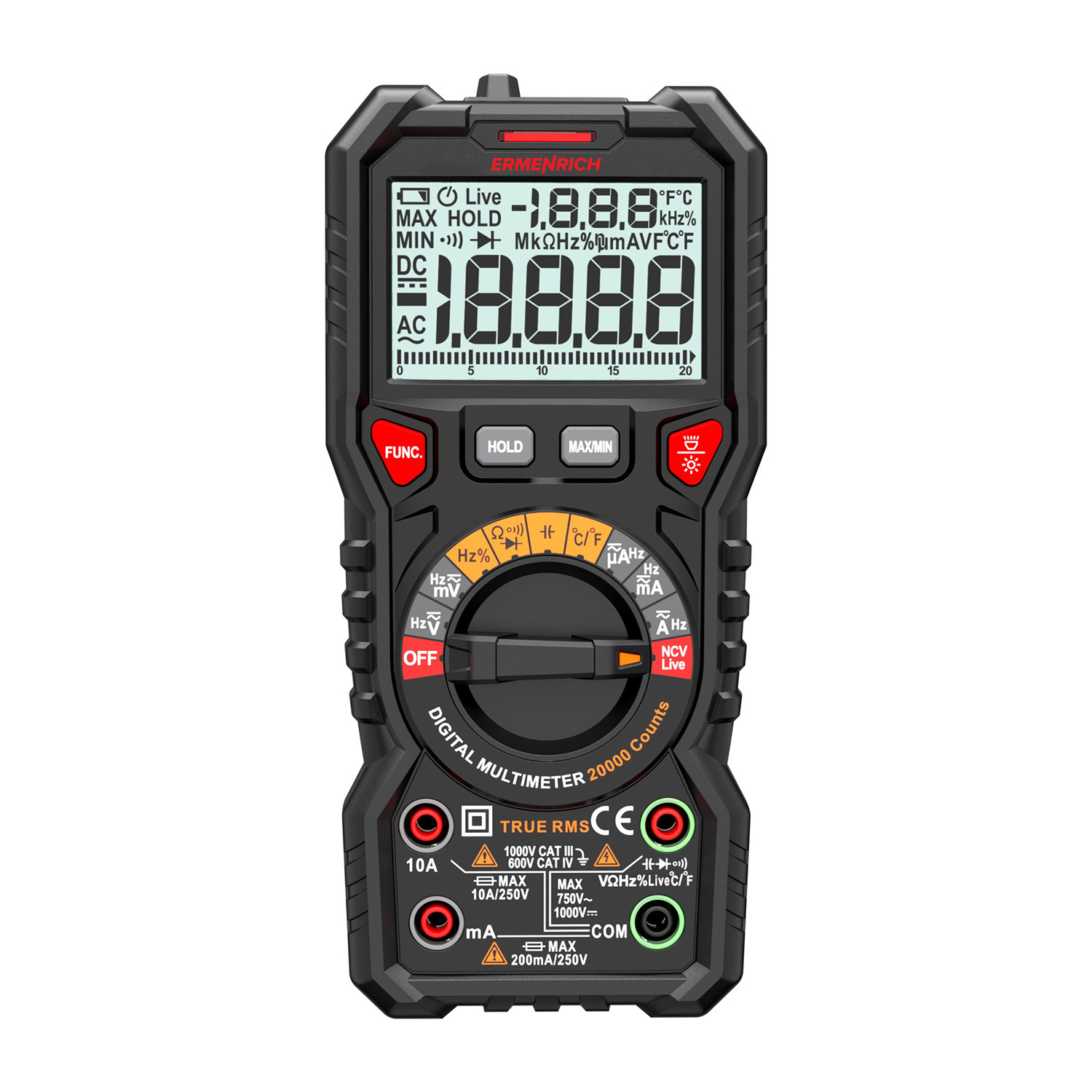 Multimetr Ermenrich Zing TC32 je kompaktní a lehký přístroj, který se vejde do kapsy. Přístroj je napájen bateriemi. Když jsou baterie vybité, přístroj vás na to upozorní. Pro úsporu energie je k dispozici funkce automatického vypnutí. K dispozici je vestavěná svítilna.