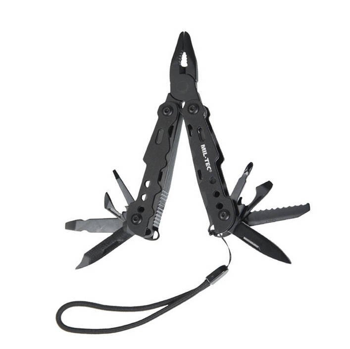 Ultrakompaktowy multitool z dołączonym do zestawu poliestrowym pokrowcem.