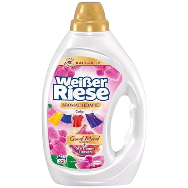 Weisser Riese gel 990ml Color Good Mood Orchidee je kvalitní prací gel na barevné prádlo navržený tak, aby rozzářil barvy a zajistil svěží pocit prádla po každém praní. Díky účinnému složení je použitelný při teplotách 20-60 °C, což šetří energii i barvy vašich oblíbených oděvů. Tento prací gel je vhodný pro běžné i citlivé barevné textilie a nabízí snadné dávkování pro 22 praní.