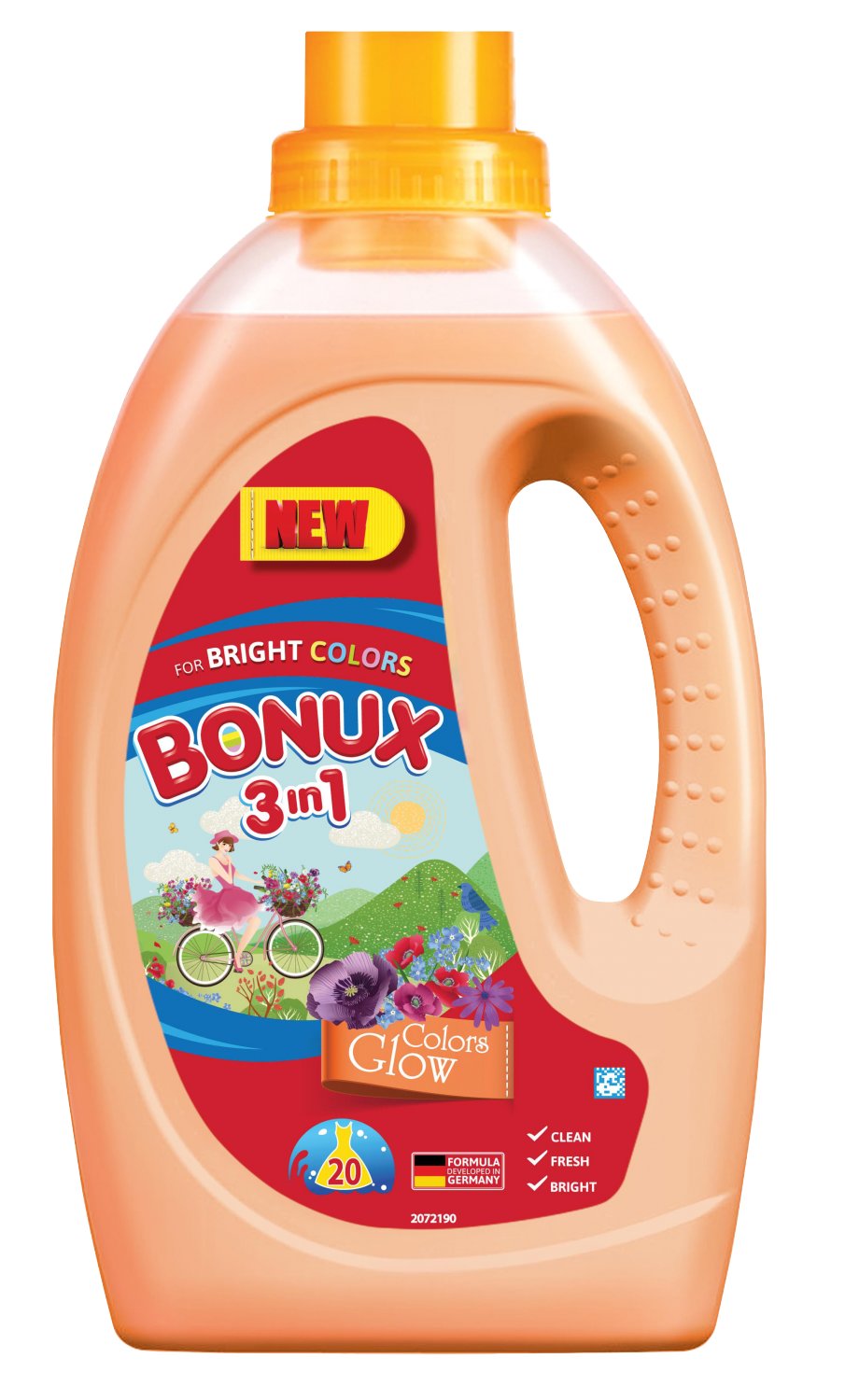 Oblečení odráží to, jak se cítíte. Ujistěte se, že barvy zůstávají stále jasné. Nový prací gel Bonux je speciální čisticí prostředek, který osvěžuje, čistí a pečuje o vaše drahocenné barevné tkaniny. Speciálně vyvinuté složení vyhlazuje hrubá bavlněná vlákna a směs bavlněných vláken. Protože pouze hladká vlákna zachovávají oslnivý lesk a syté barvy. Působivý výkon a péče. Chrání barevné tkaniny před vyblednutím.